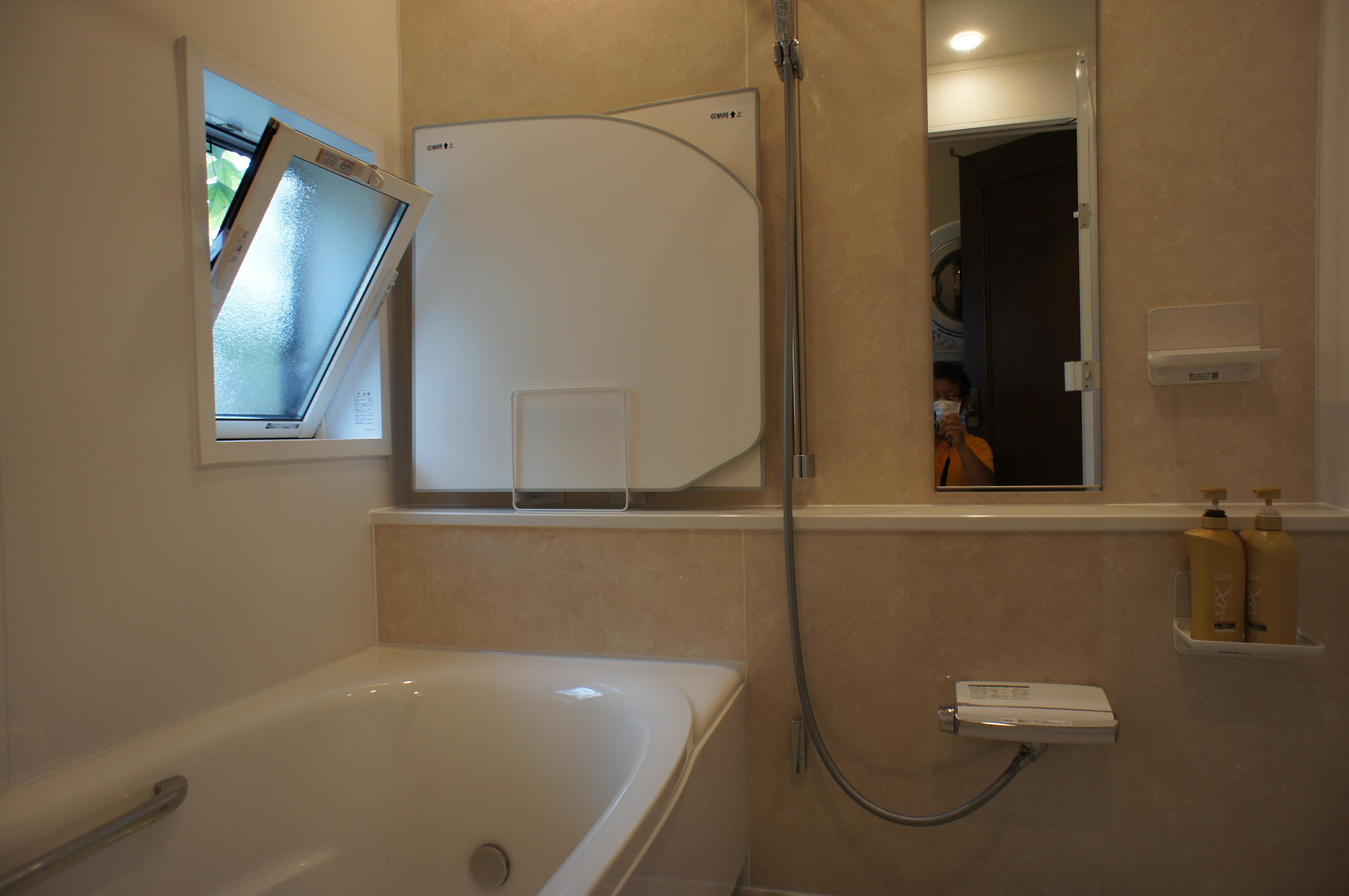 お客様の事前のご要望として①既存浴室サイズを替えないこと②鏡の位置も洗面室から全身確認できること③フロフタを前面にマグネットで固定したい④窓は現状と同程度のものが良い と具体的にご指導いただき実現できたこと本当に良かったです。 浴室換気乾燥暖房機の納期遅延により工期調整を余儀なくされ、暑い時期でのリフォームで大変ご不便をお掛け致しました。 今回のLIXILリデアは壁パネルが全面マグネットが使用できるため市販の風呂フタ収納が利用できお客様のご要望どおりカスタマイズできました。