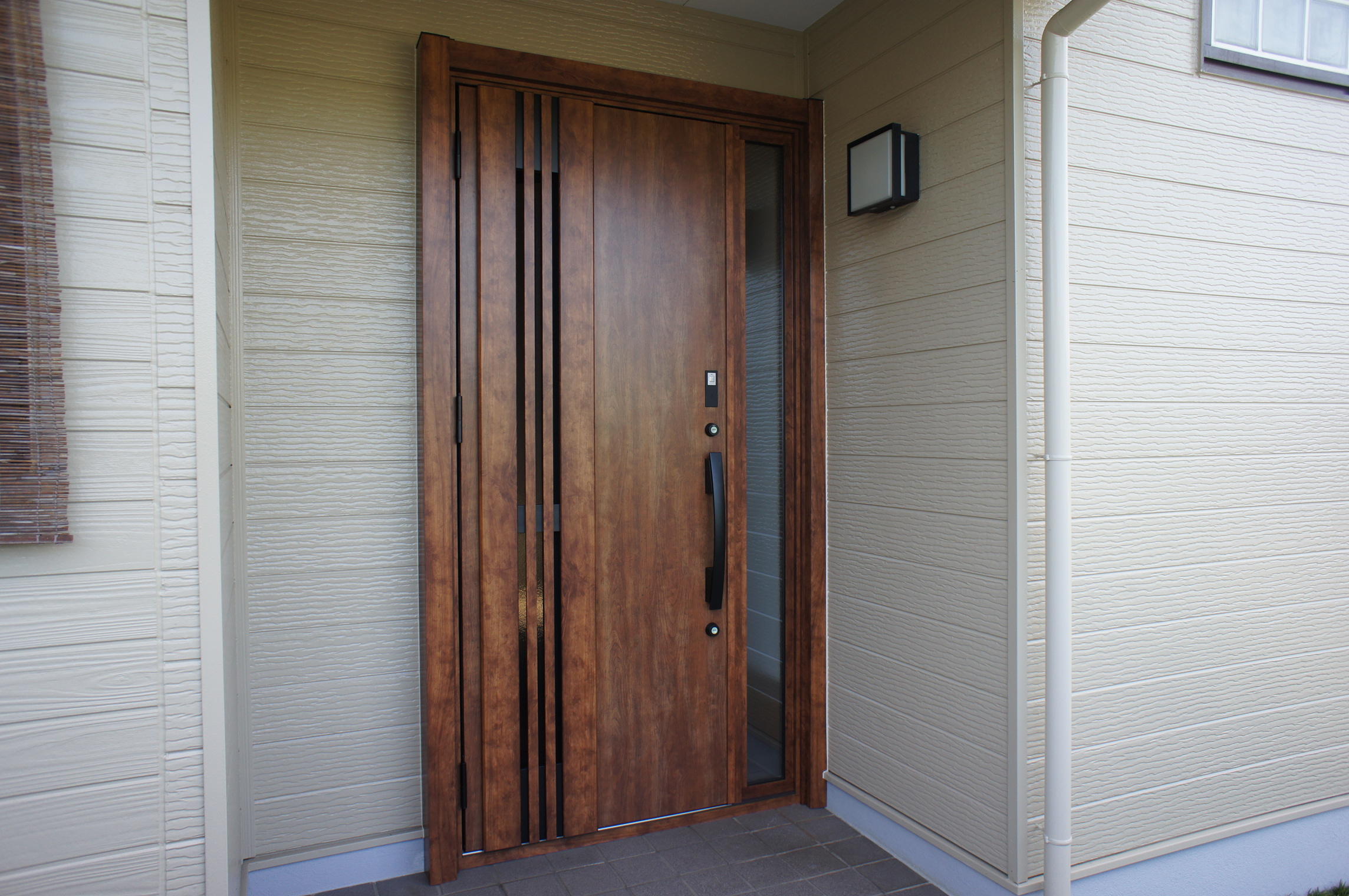 LIXIL/リフォーム用ドア・リシェント玄関ドア3 断熱仕様K4タッチ(キー付)片袖L・ハンドダウンチェリー(CC)施工事例