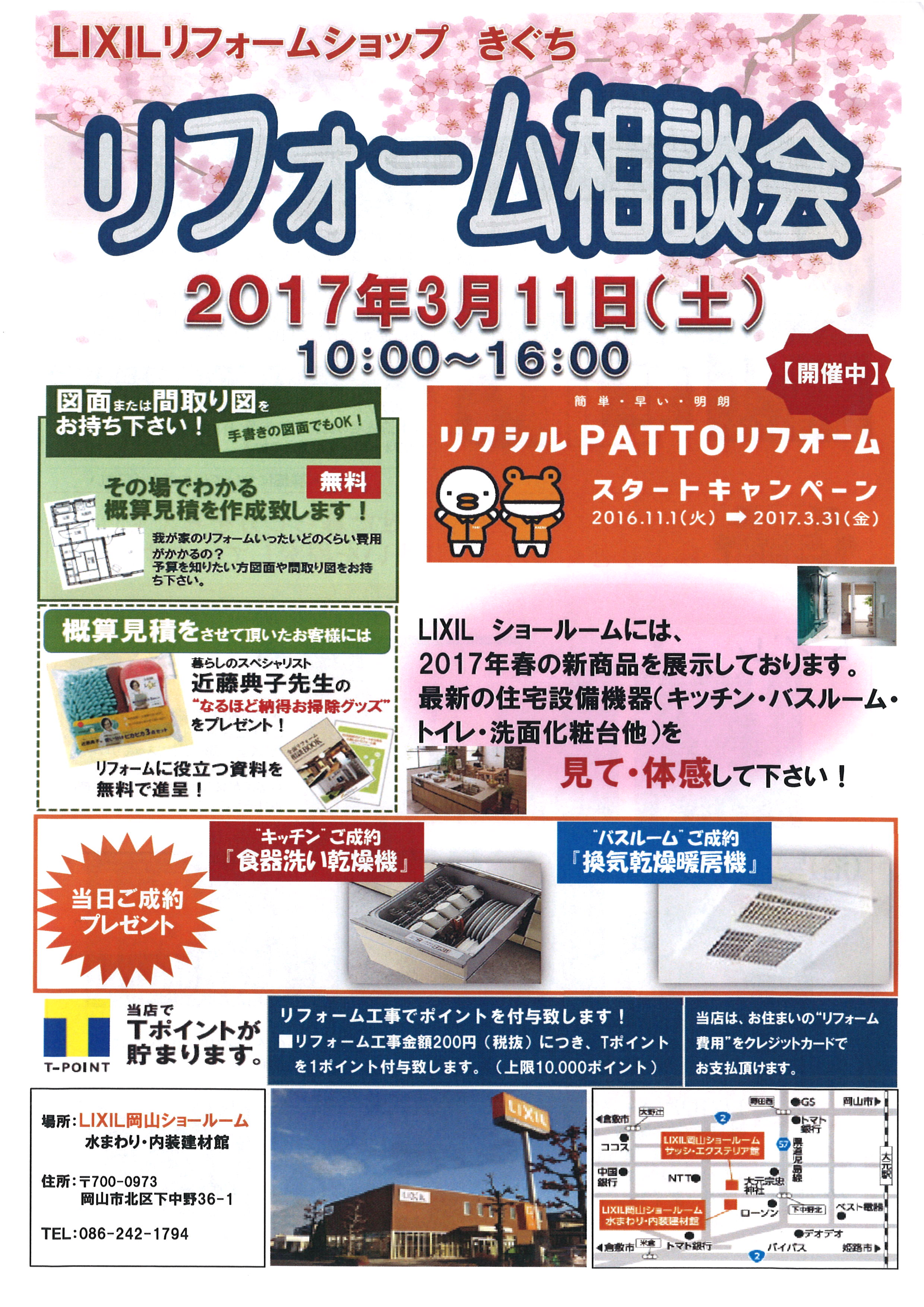 日時:2017年3月11日(土) 10:00~16:00 会場:株式会社LIXIL 岡山ショールーム 会場住所:岡山市北区下中野36-1