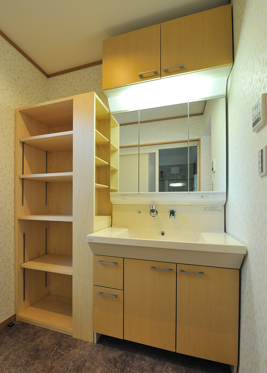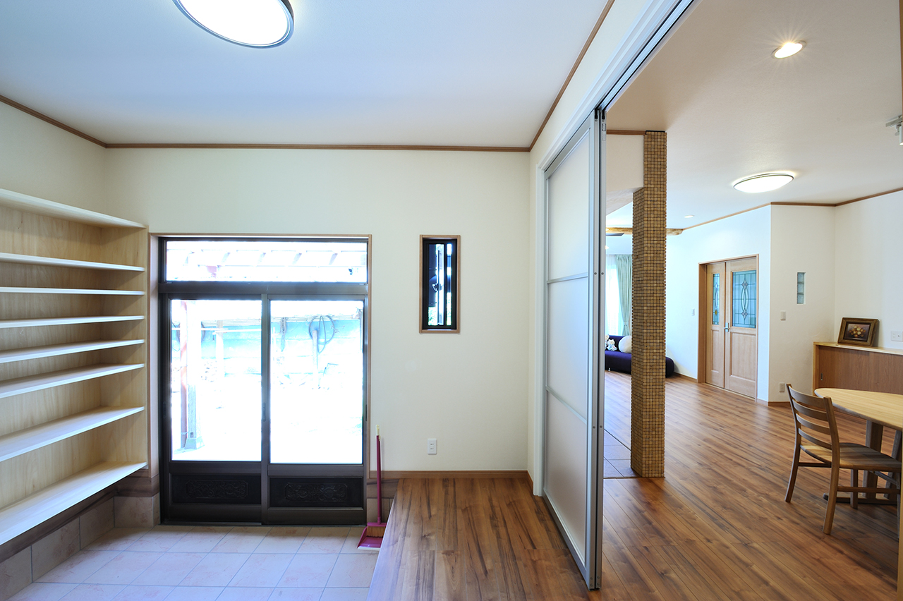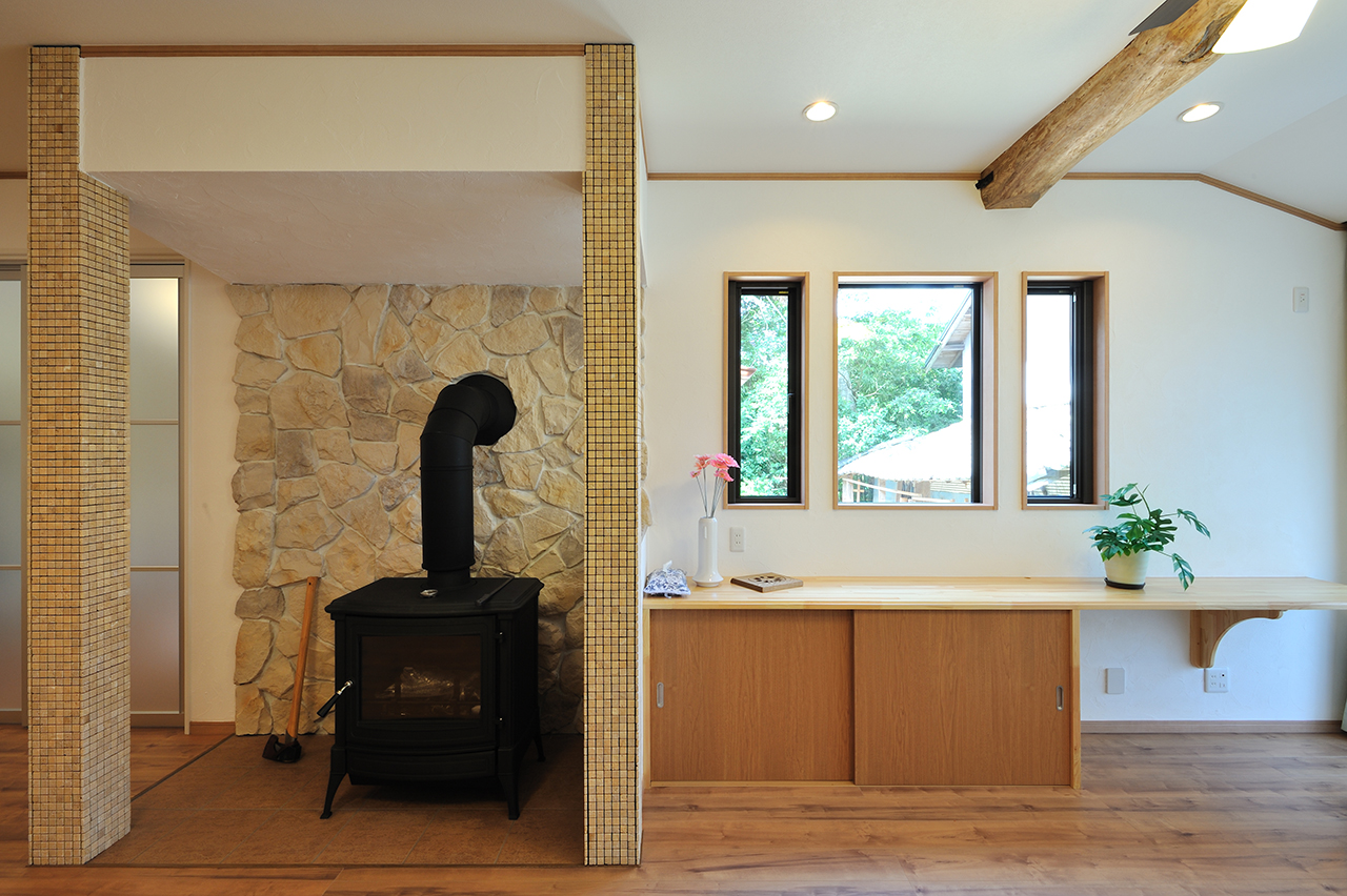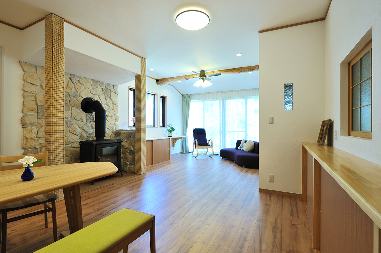 生活動線を見直し間取りを変更。 ご主人ご希望の薪ストーブを設置しエコで見た目にも暖かいリビングと、奥様ご希望のラウンドキッチンで会話の絶えないダイニングキッチンが出来あがりました。