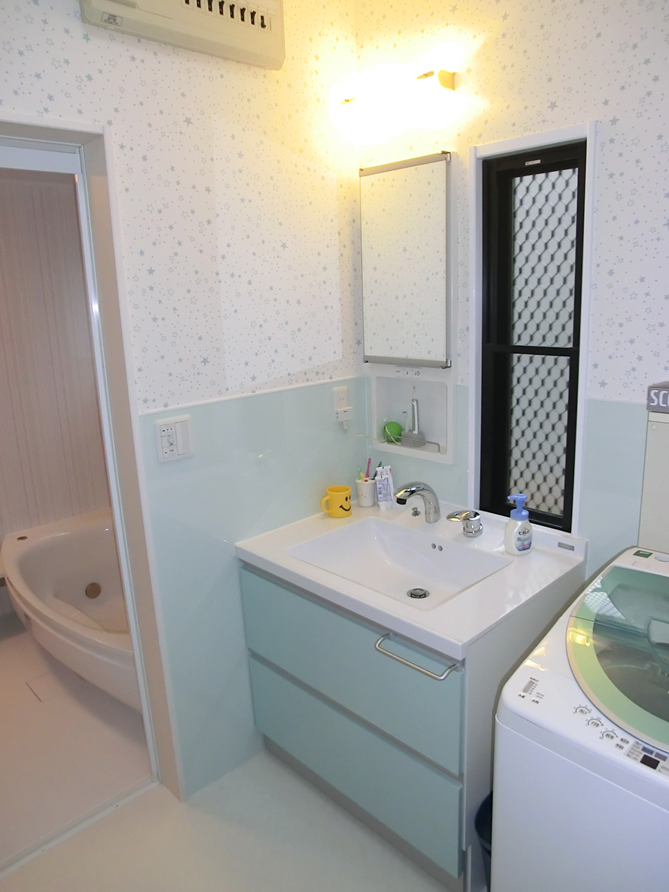 工事はまずお風呂の解体、洗面室の解体から行いました。窓や外部の換気扇などが終わってから屋根の重ね葺き、外壁の塗装という順番で施工しました。洗面室のクロスや洗面台の色などお客様のこだわりが仕上がりを可愛くしていくエッセンスとなり柔らかいイメージに仕上がりました。