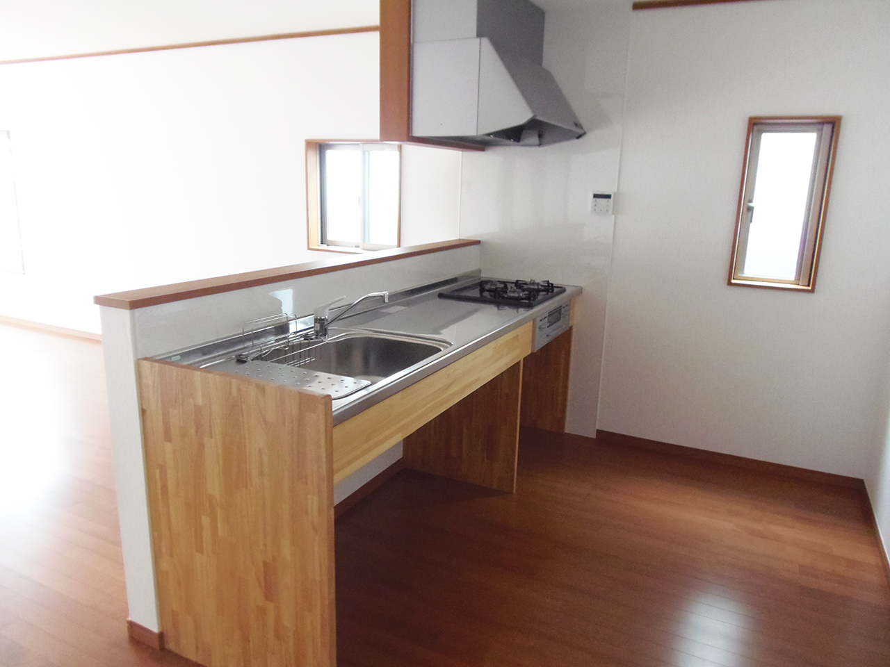 キッチンは造作のペニンシュラタイプに。リビングにいる子供をみながら炊事もできます。