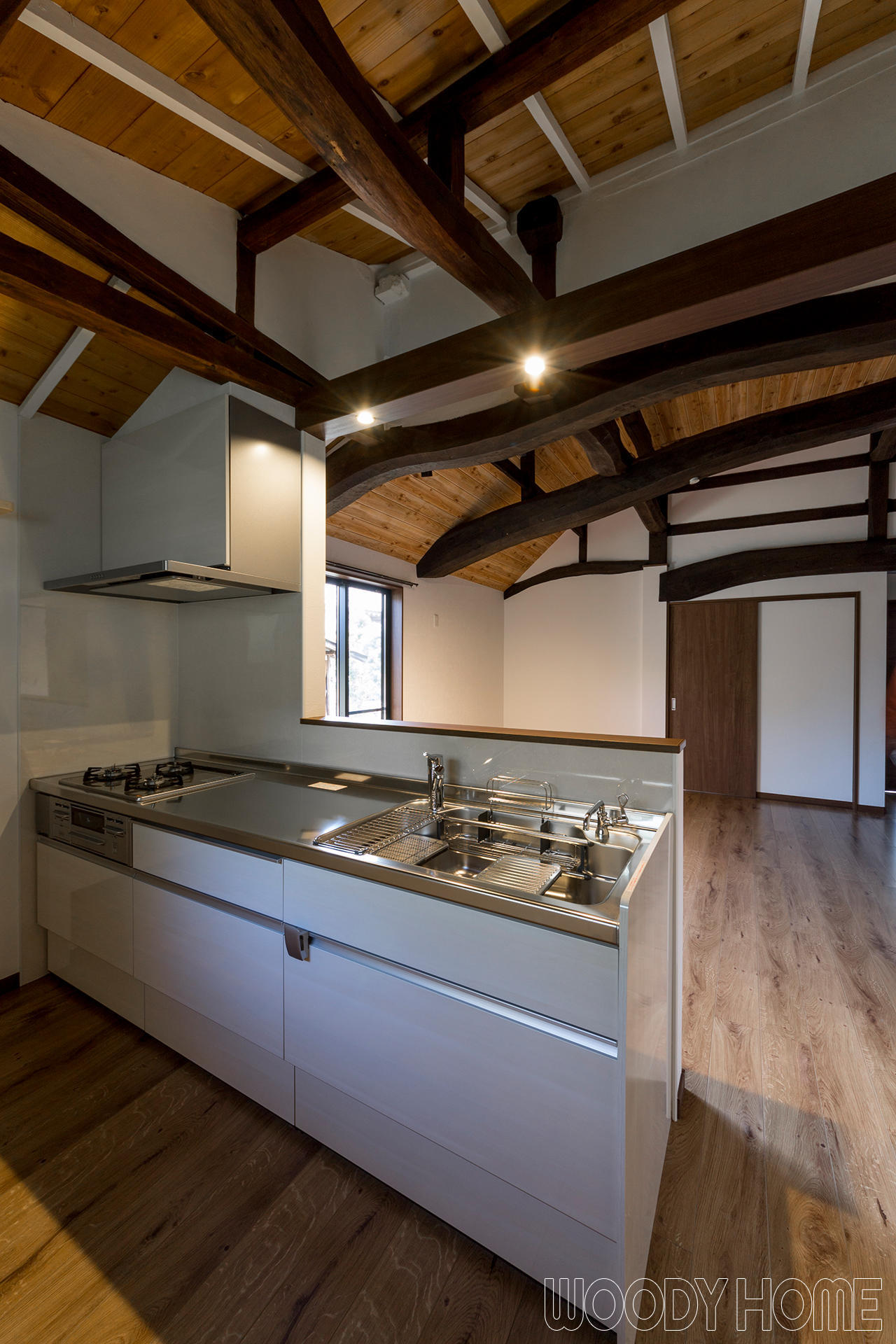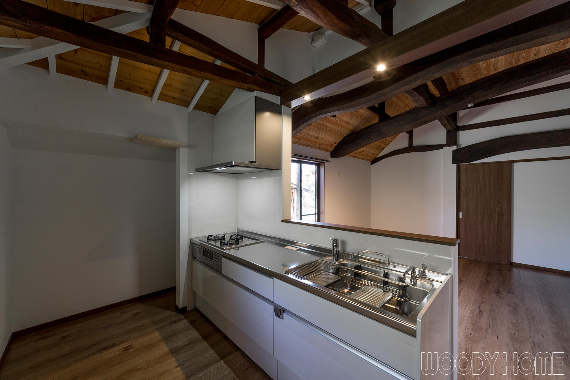 水栓を2つ設置してあり、1つは上水でもう一つは井戸水が出るようにしました。シンクは中に2段のプレートが置ける「家事ラクシンク」で洗い物が楽にできます。キッチンの上には化粧梁を取付し、その中にダウンライトを設置しました。