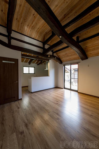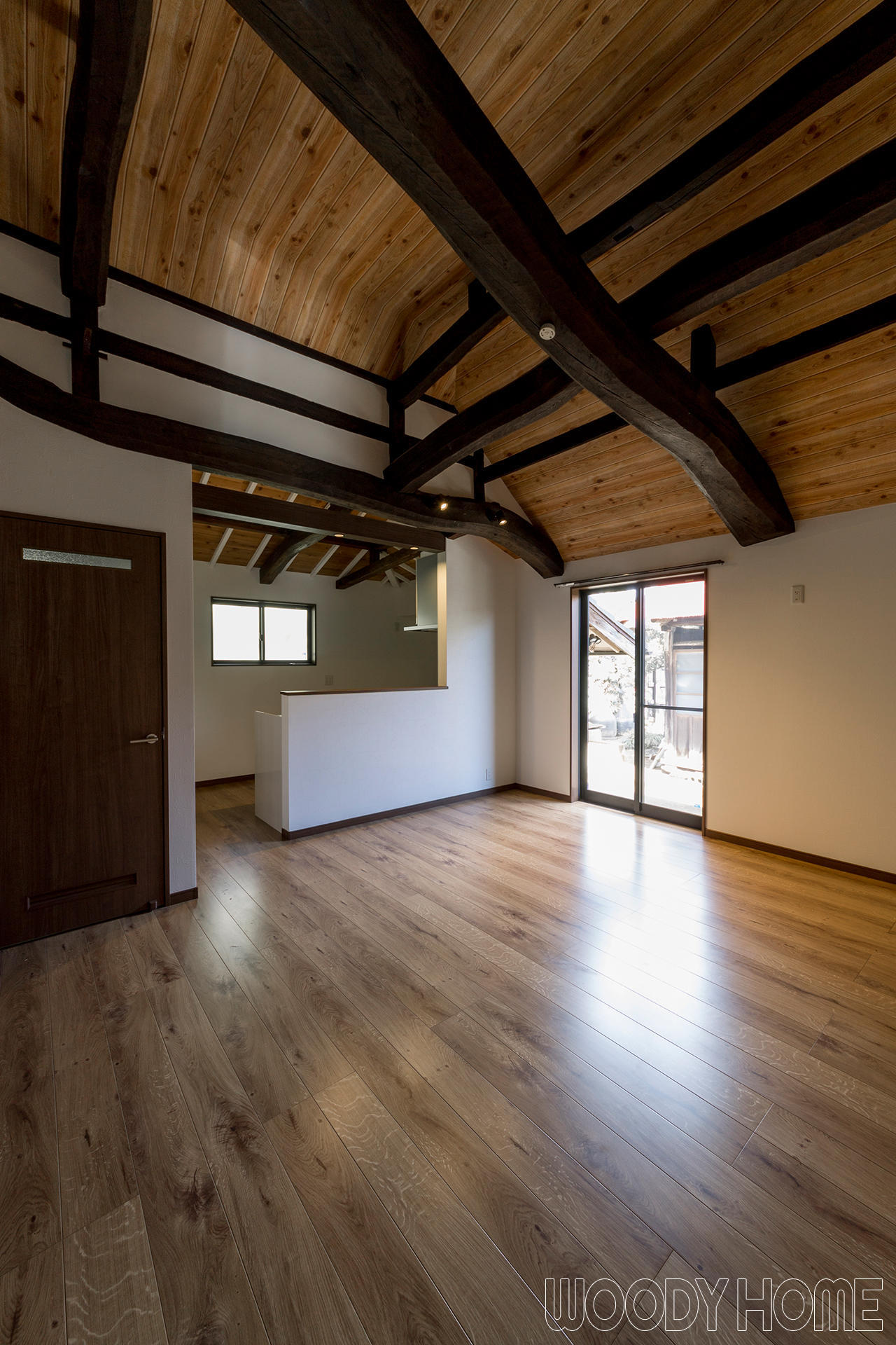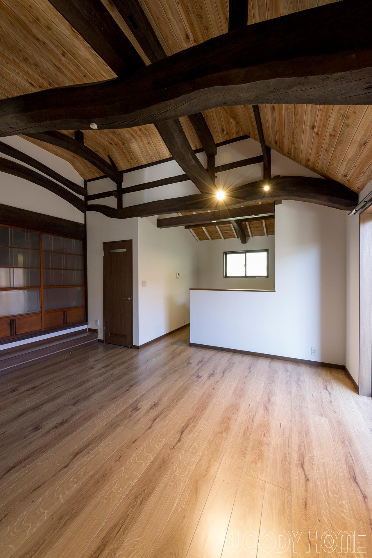 梁より上は元々漆喰だったので塗りなおして仕上げました。梁より下は新規で壁を造ったので漆喰仕上げのような柄のクロスを張りました。