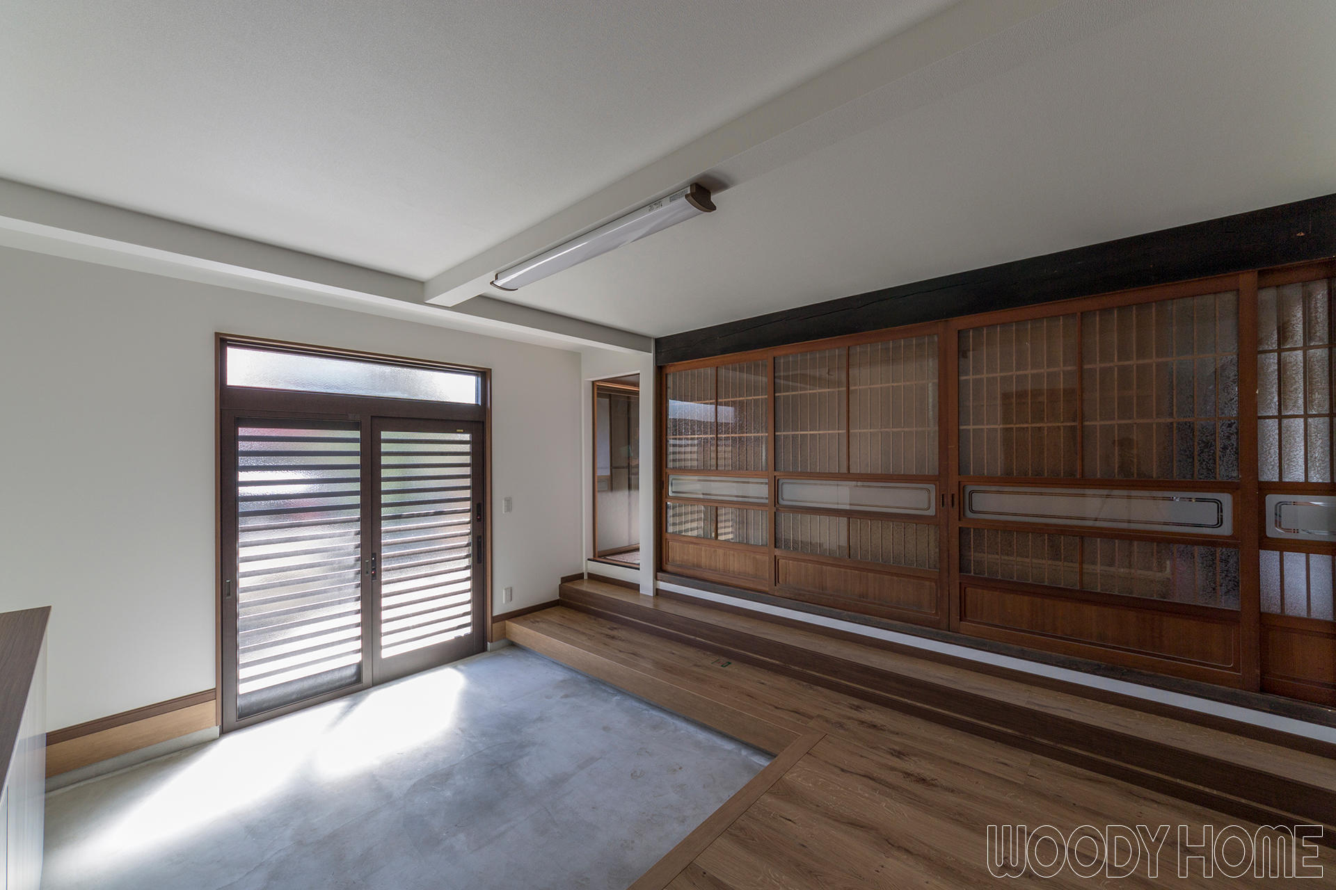 昔ながらの玄関先でゆっくり出来るような土間のスペースを作りました。玄関ホールの床面と和室との段差が30㎝程あり、上り下りが大変なので一段造作しました。