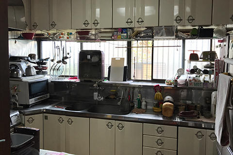 以前はダイニングキッチンとリビングと分かれていましたが、このリフォームでリビングダイニングとキッチンという風に分けました。システムキッチンをダイニング向きに置いて、両脇を通路にした事でぶつかりにくい家事動線になりました。