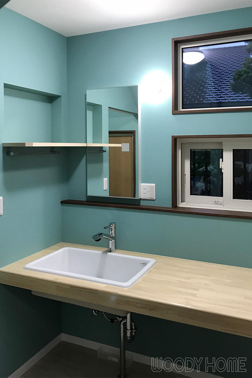 洗面台は当社工事部の大工による造作です。上のサッシは工事中にお客様からもっと採光が欲しいとのご要望で追加で設置しました。サッシは断熱性の高いLIXILの樹脂窓「エルスターS」です。