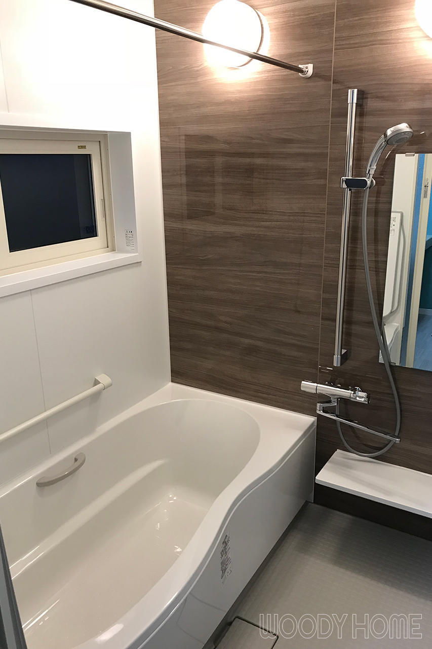 間取り変更したおかげで入れられたユニットバスは、LIXILの「アライズ」。換気乾燥暖房機付きです。温度差によるヒートショックの予防にまた、梅雨時等はちょっとした物干しもできて便利です。こちらもサッシは断熱性の高いLIXILの樹脂窓「エルスターS」です。