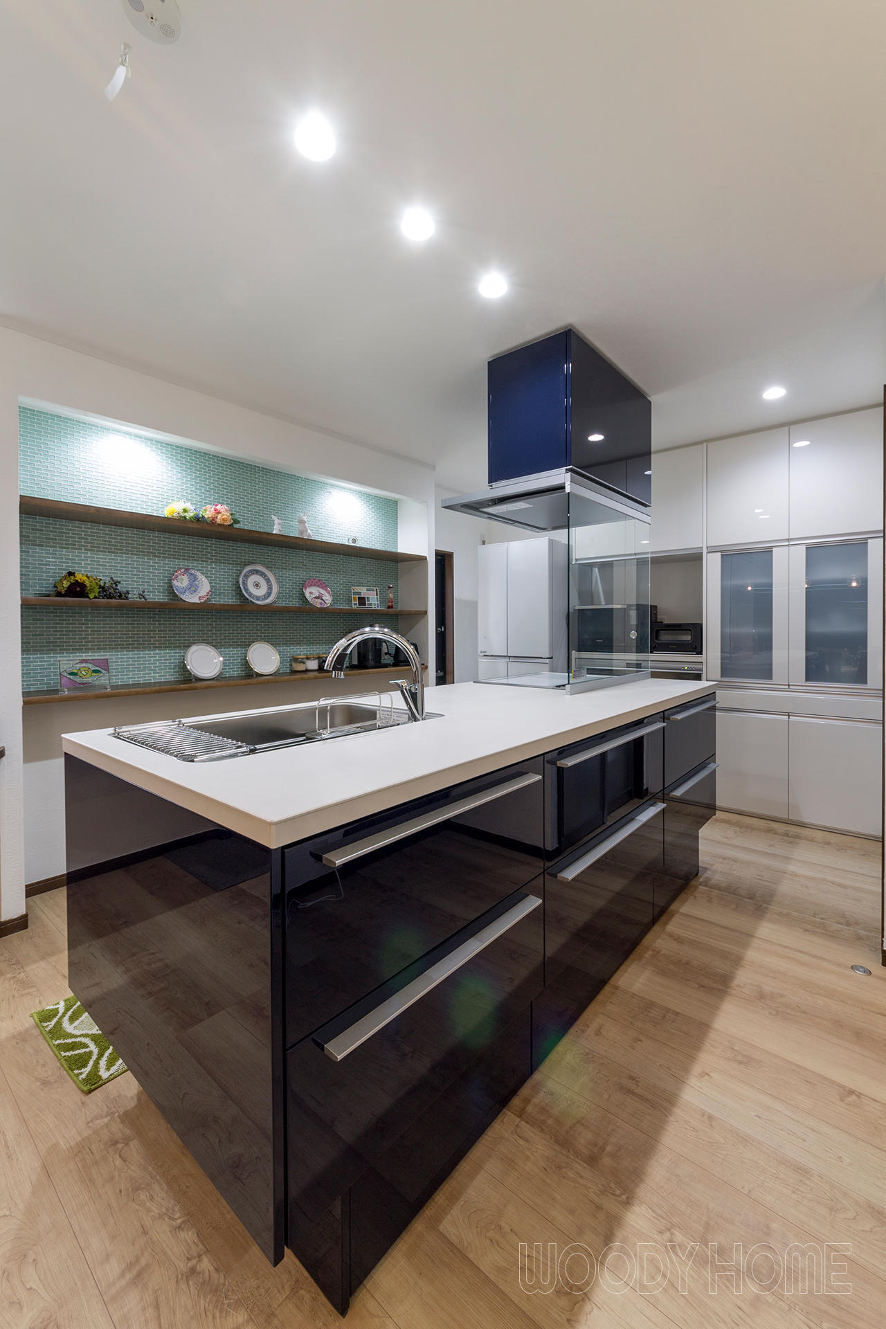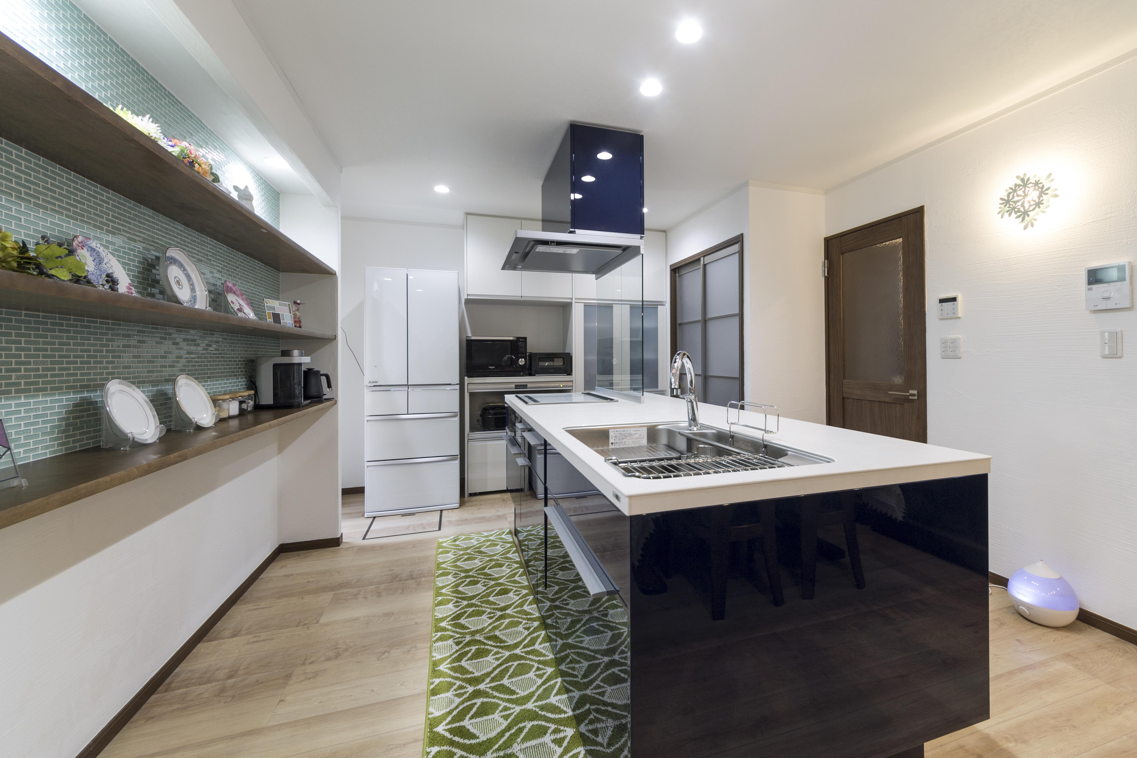 対面式の少し片隅にあったキッチンが堂々と主役に踊り出ました。間取り変更に伴い向きを変えたアイランドキッチン、システムキッチンはLIXIL「リシェルSI」です。傷つきにくくお手入れが楽な白のセラミックトップに、面材は落着いたイメージの鏡面仕上げのロイヤルブルーでお洒落にコーディネート、見せるキッチンに生まれ変わりました。対面側の収納キャビネットは、収納し易くたっぷり収納できる引出しタイプでとても使いやすくなりました。