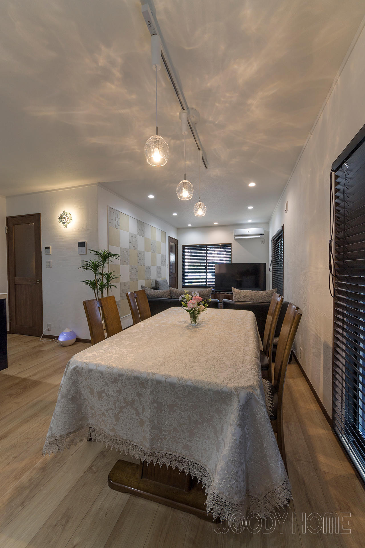 LDKの照明はシーリングライトは付けずにダウンライトをメインに。ダイニングはダイニングテーブルの上につけた3つのペンダントライトのガラスを通した光が、壁や天井に反映して夜は特に素敵です。