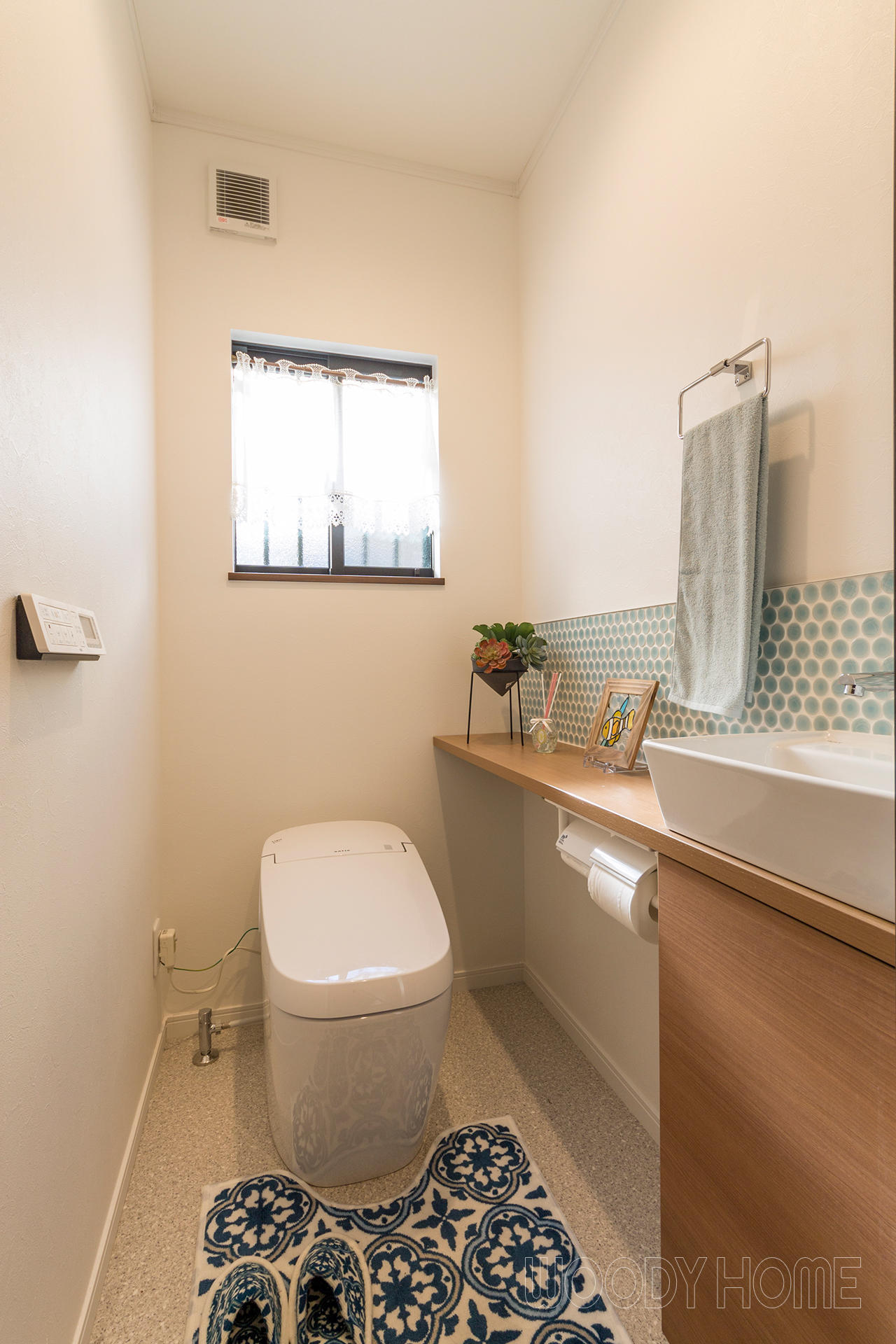 トイレはLIXILの「サティスGタイプ」へ入れ替えました。 手洗い器を付けた壁面の棚の上には、アクセントでキッチン背面と同様"ブルーグレー"のモザイクタイルを貼ってお洒落に演出。