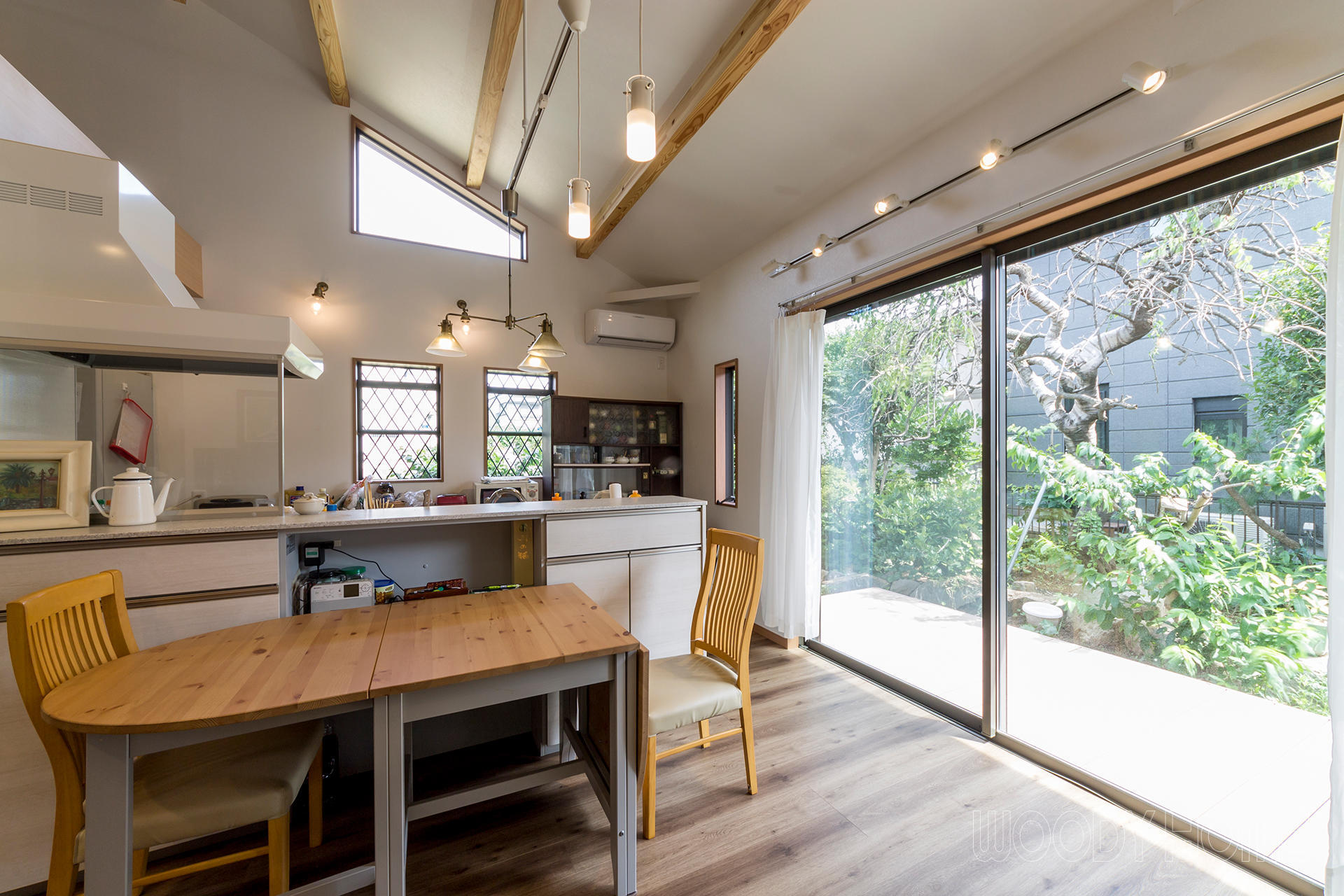 陽射しがいっぱいに入るダイニング。南向きの面には大きな掃出し窓、東向きの面はキッチンがあるので採光量を考えて窓を配置。