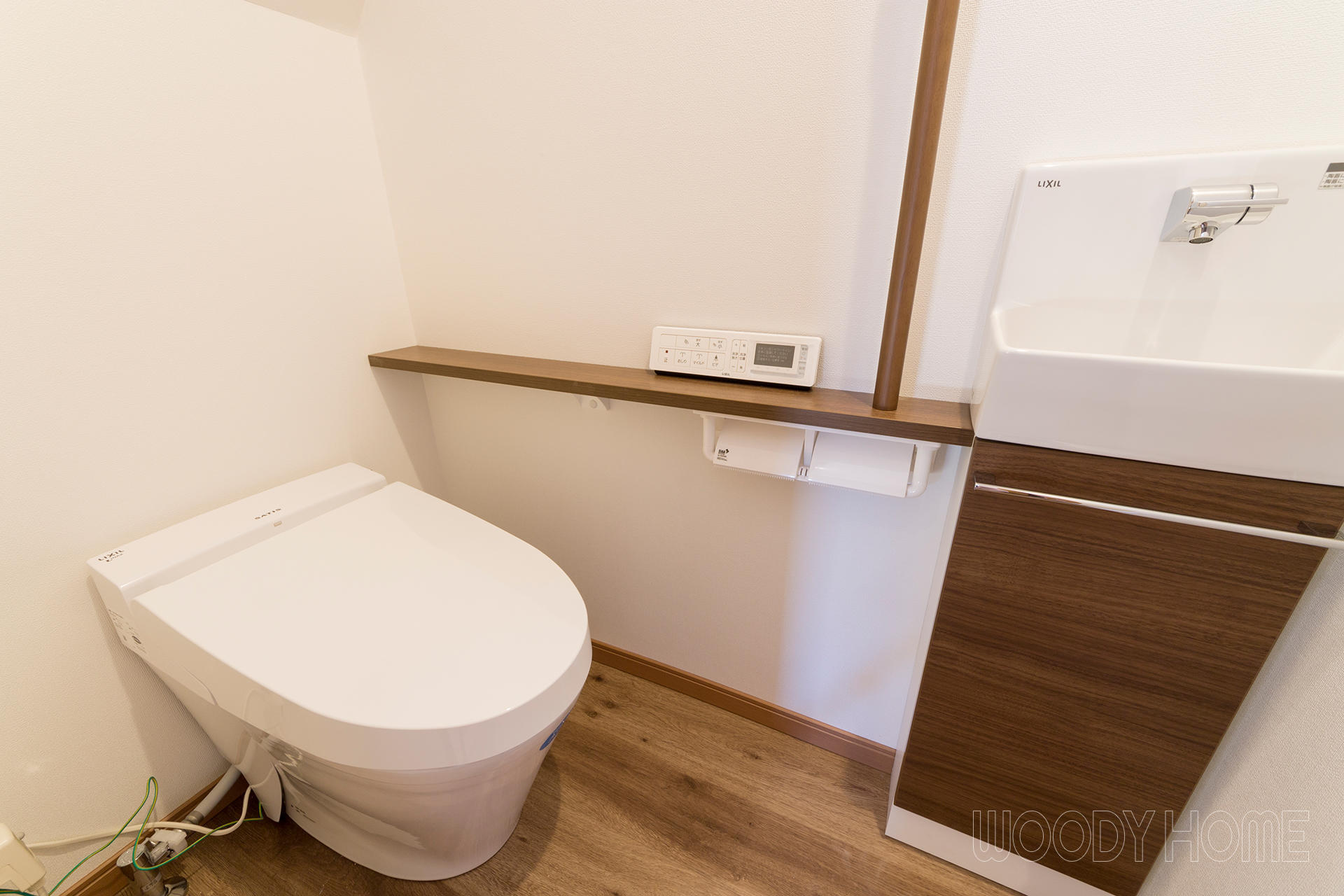 階段下にお客様用トイレを設置。もう一か所、お父様の寝室脇にもトイレを設けてあるので夜でも安心です。