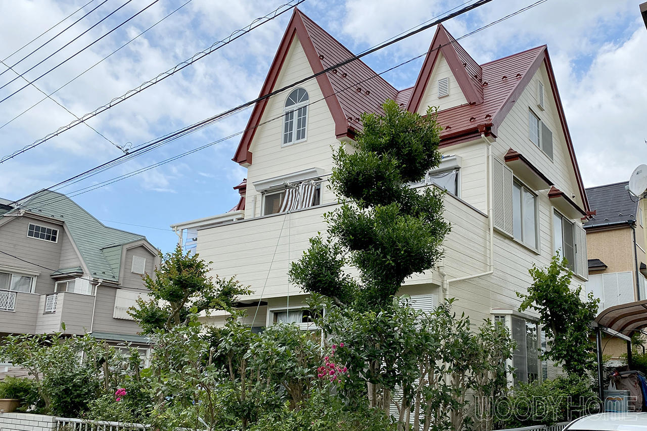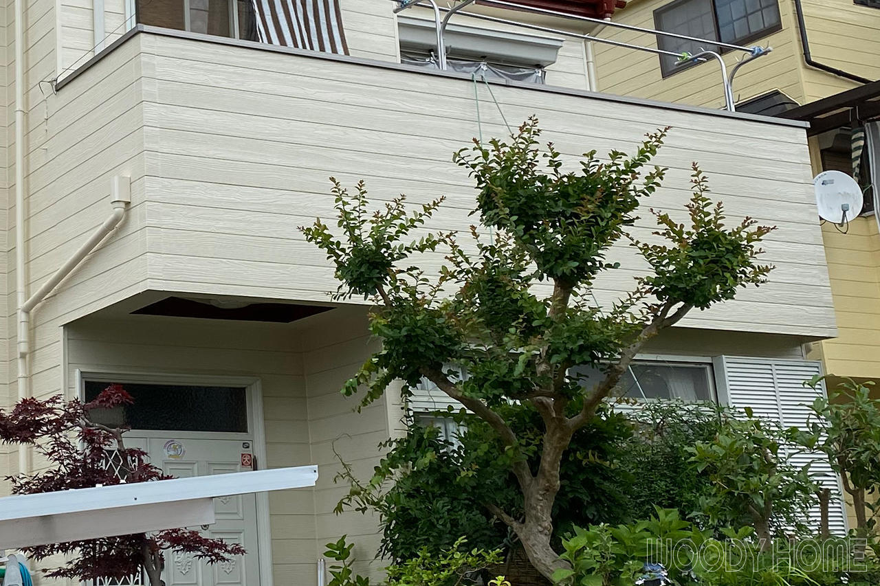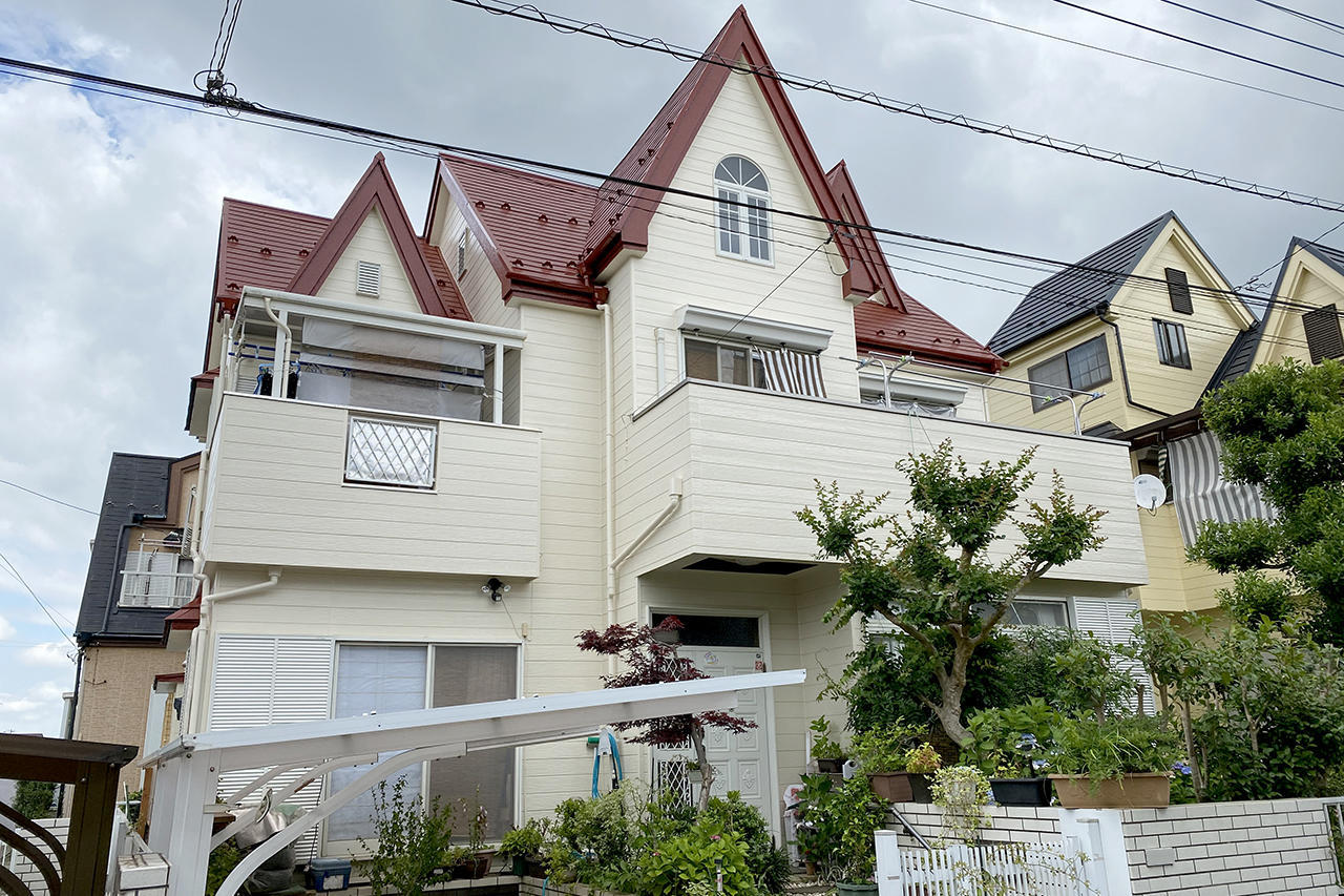 屋根は破損した後面はスレート屋根の葺き替え、破損のない前面は塗装で仕上げましたが全く違和感がありません。外壁は高耐久・高耐候で防カビ材の入った長寿命塗料で仕上げました。屋根・外壁の配色を、茶色の屋根にベージュの壁として南欧風の外観に仕上げました。