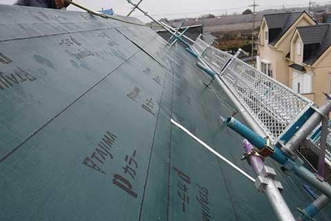 ルーフィングを貼ったところです。屋根勾配がきついので、安全性と作業性のため屋根足場を建てました。