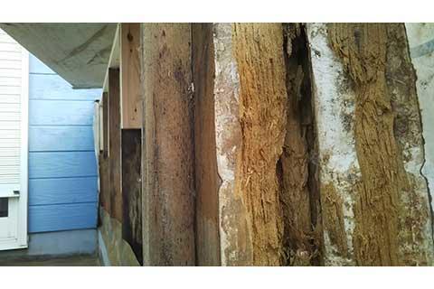 「床が浮いた感じがする」とご相談頂いたベランダの壁内。雨水などで柱が腐朽していましたが、雨水などが原因でベランダの床が「浮いた感じ」にもなっていたようです。