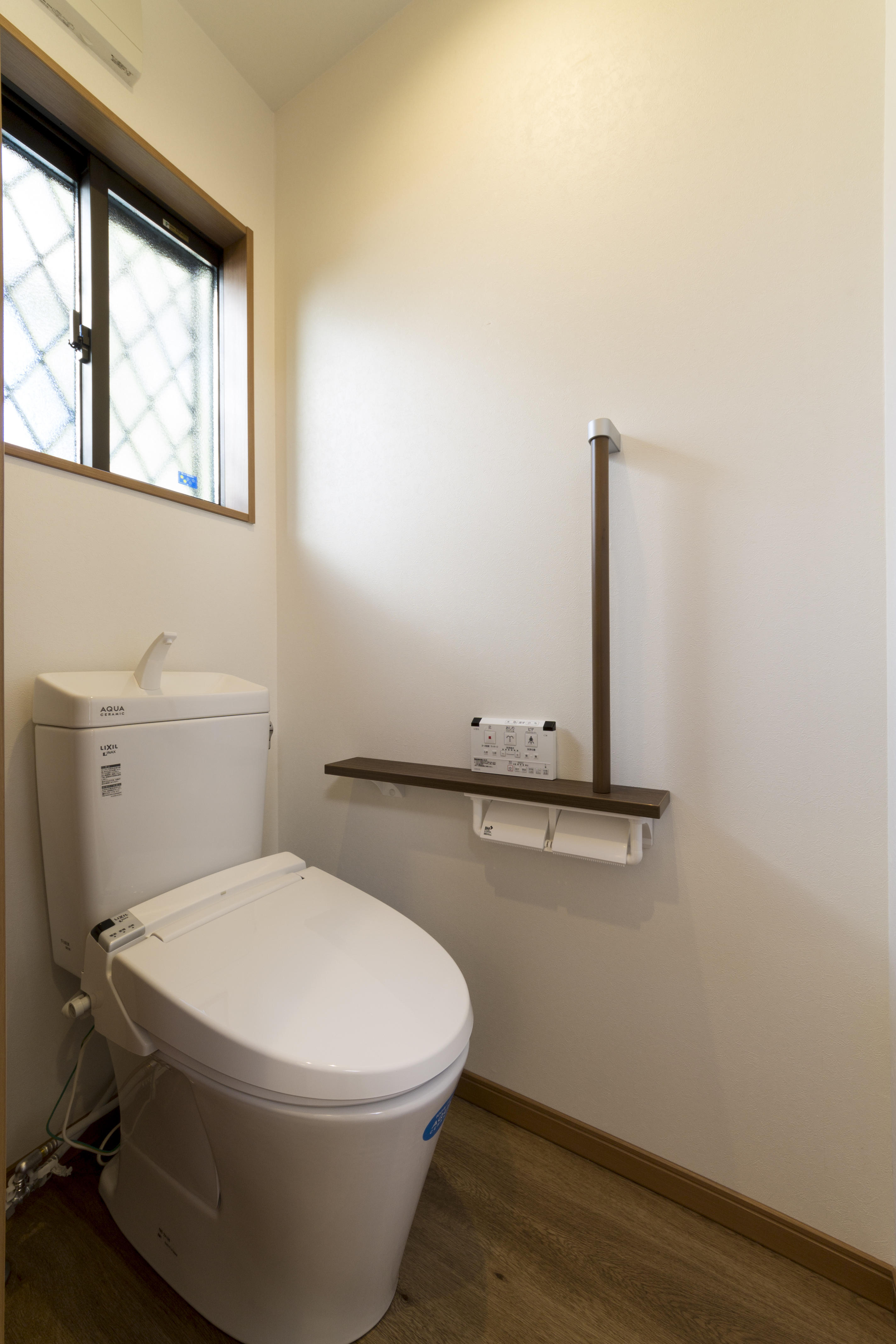 段差もあり、冷たく清掃も大変なトイレとの事でしたので まず床を平らにしてつまずき防止や手摺を設置することで安心して使える空間にいたしました。 床下や壁にも断熱材を充填し暖かくして壁や天井もクロス仕上げで明るいトイレになりました。