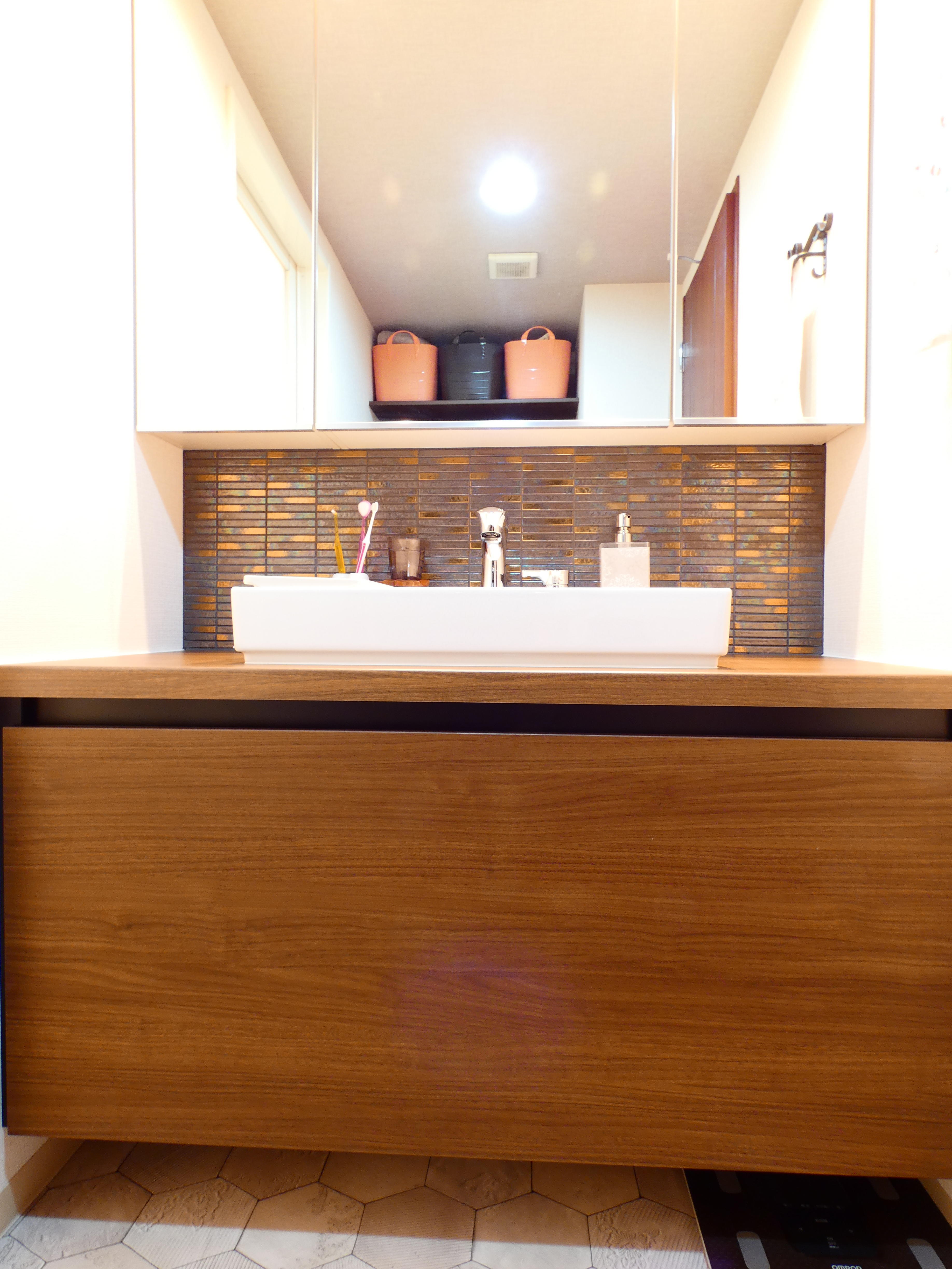 洗面室をアジアンなホテルのような雰囲気にしたいご要望でした。 洗面前のタイルをご一緒にチョイスして素敵なアジアンなホテルのようになりました。 収納も引き出しの中にもう一段引き出しがあるので収納力もあります。 トイレお掃除がラクになり、扉やカウンターも木調にして統一したことで素敵度が増しました。