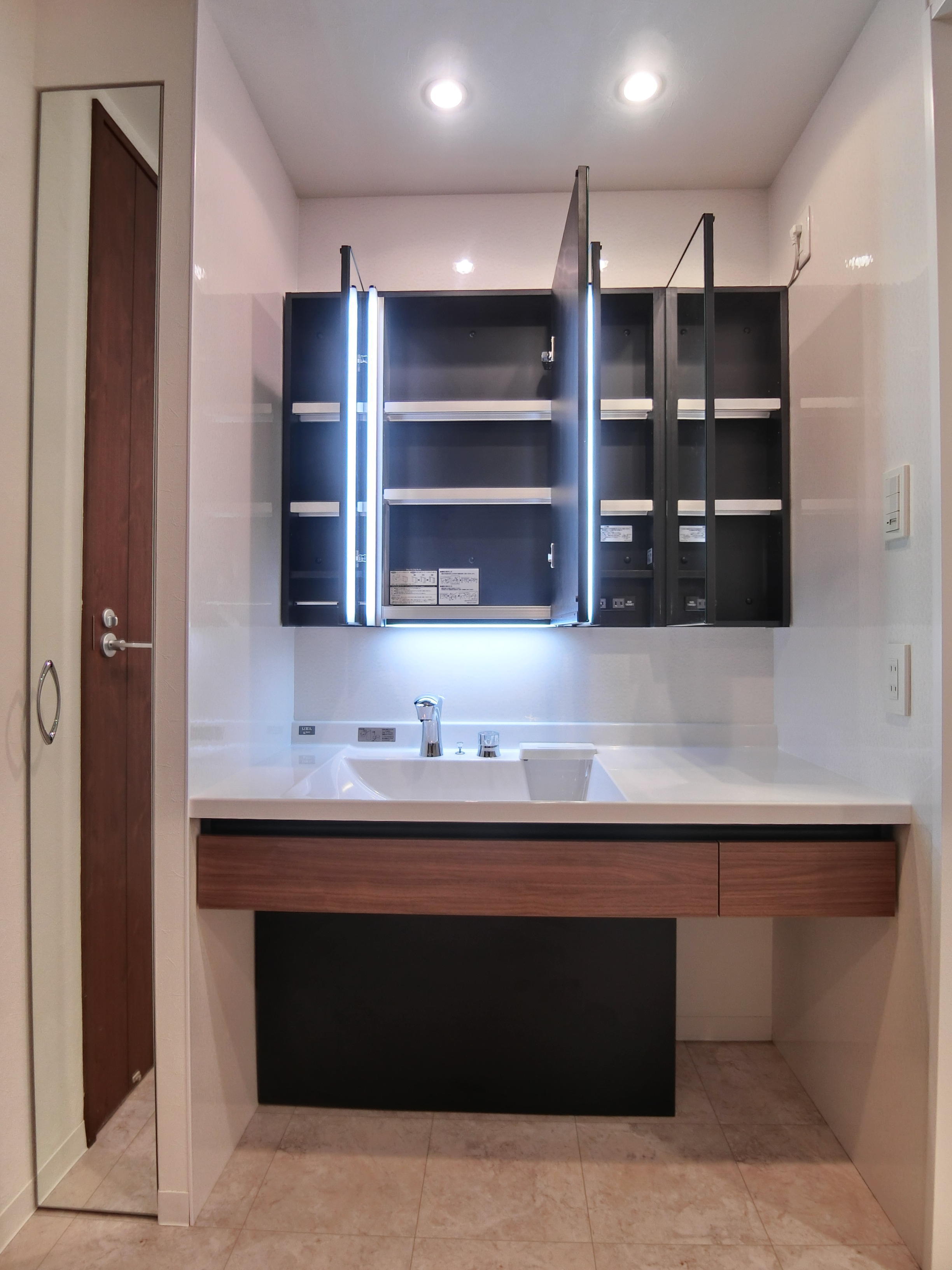 いつもありがとうございます。 私がまだ経験の浅かった11年前からのお付き合いのあるお客様で、私が尊敬しているご夫妻様です。 お会いしたのは、マンション住まいで部屋のカビと収納不足のお悩みで呼んでいただいたのがきっかけでその時は間取りの変更工事をさせて頂きました。 換気が重要だと考え、風の流れをよくするためにウォークスルー収納にし、壁面には断熱施工を施し、カビが生息しずらいカルクウォールというスイス漆喰を施工させていただきました。 今でもカビは一切発生していないので嬉しい限りです。 その後、内窓工事で2回、トイレ工事、網戸新設と何度もお声をかけて頂いていることに感謝しております。 今回は浴室と洗面室空間での依頼がありました。 お身体の調子が悪い時もある奥様のご要望で椅子に座ったままメイクが出来る化粧台。これには一番ご要望に合ったルミシスをご提案しました。 また、そんな奥様思いのご主人様からのご要望のクッション付きのベンチシートが付いた浴室、スパージュをご提案しました。 そんなご夫婦の関係を見ていると私はいつも勉強させていただき、私が育てられている気がします。 奥様は背が高くない方なので、化粧台の高さを現場で5㎝カットし背の高さに合わせました。 縦のライン上の照明のフェイスフルライトで影映りもないメイク空間にできました。 化粧台の左横には収納不足でお困りでしたので、1点物の姿見付きの扉を建具職人に作ってもらい収納を設置。 ダイソンの掃除機の置き場にもお悩みでしたので、収納の中にコンセントを新たに設置し、壁にダイソンの掃除機を掛けられるようにしました。 大変満足頂けて、私も恩返しができたようで大変光栄でした。 また何かございましたらいつでもお声をかけてください。 本当にありがとうございました!