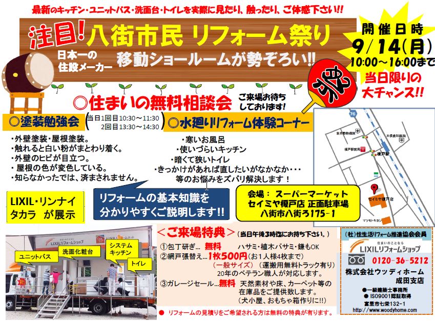今回リフォームを考えているかた!将来リフォームを考えているかた!また大切なかたにリフォームを贈りたいかた!省エネを考えているかた!すばらしい特典があります。また『失敗しないリフォーム』外壁塗装勉強会を行います。