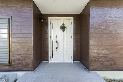 ポイントはブラウンに映える白い玄関ドア LIXIL「リシェント」。とても素敵です。