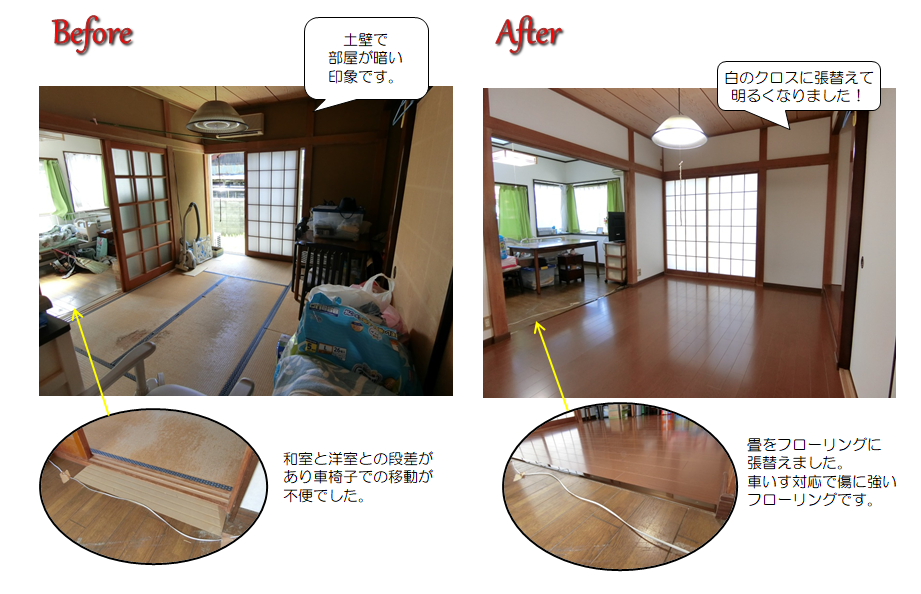 本日は、和室の畳をフローリングに張替え、洋室との段差をなくし、車いすでの移動がしやすいように