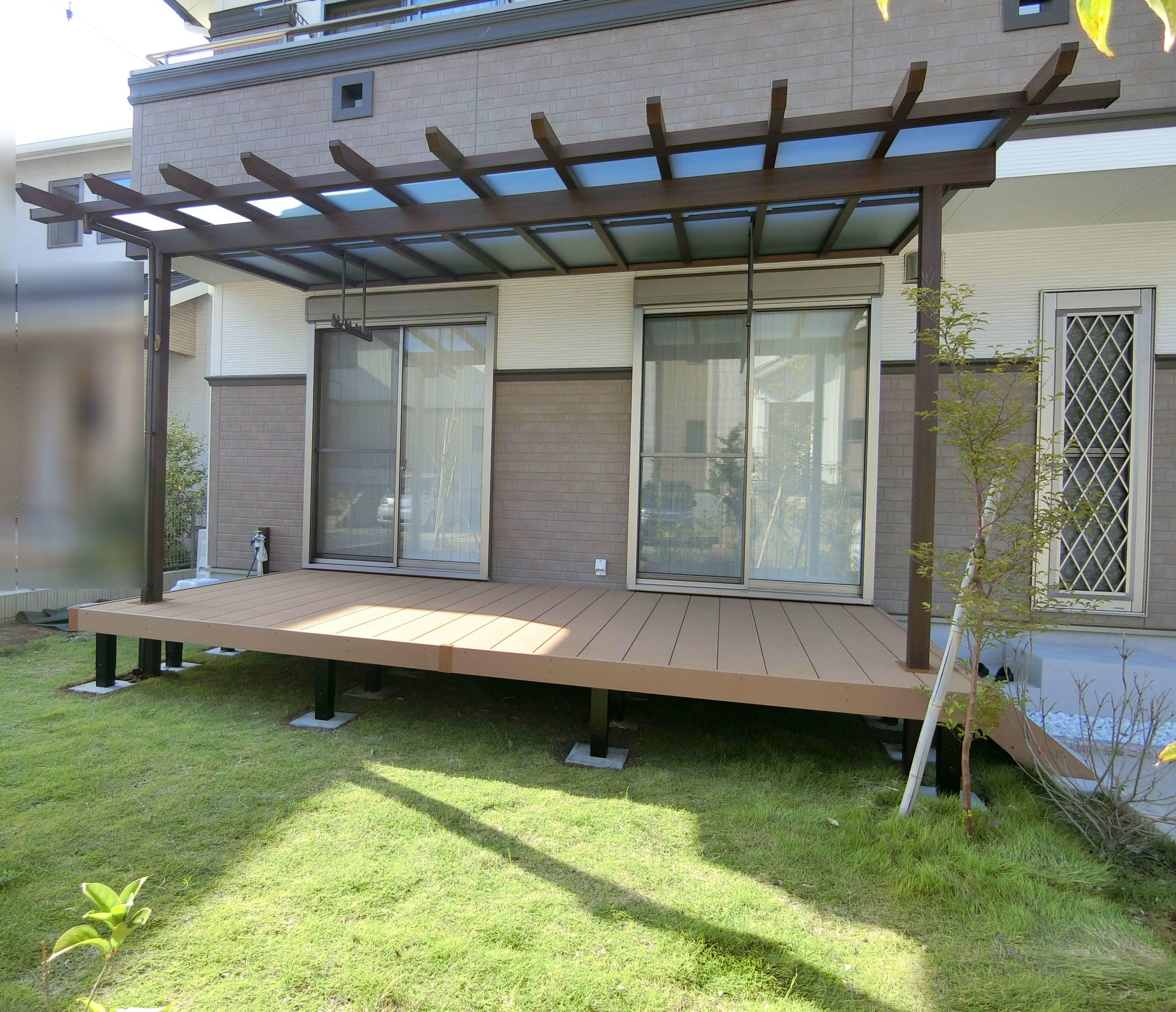 部屋の床面とフラットな位置のデッキと、テラス屋根を設置しました。