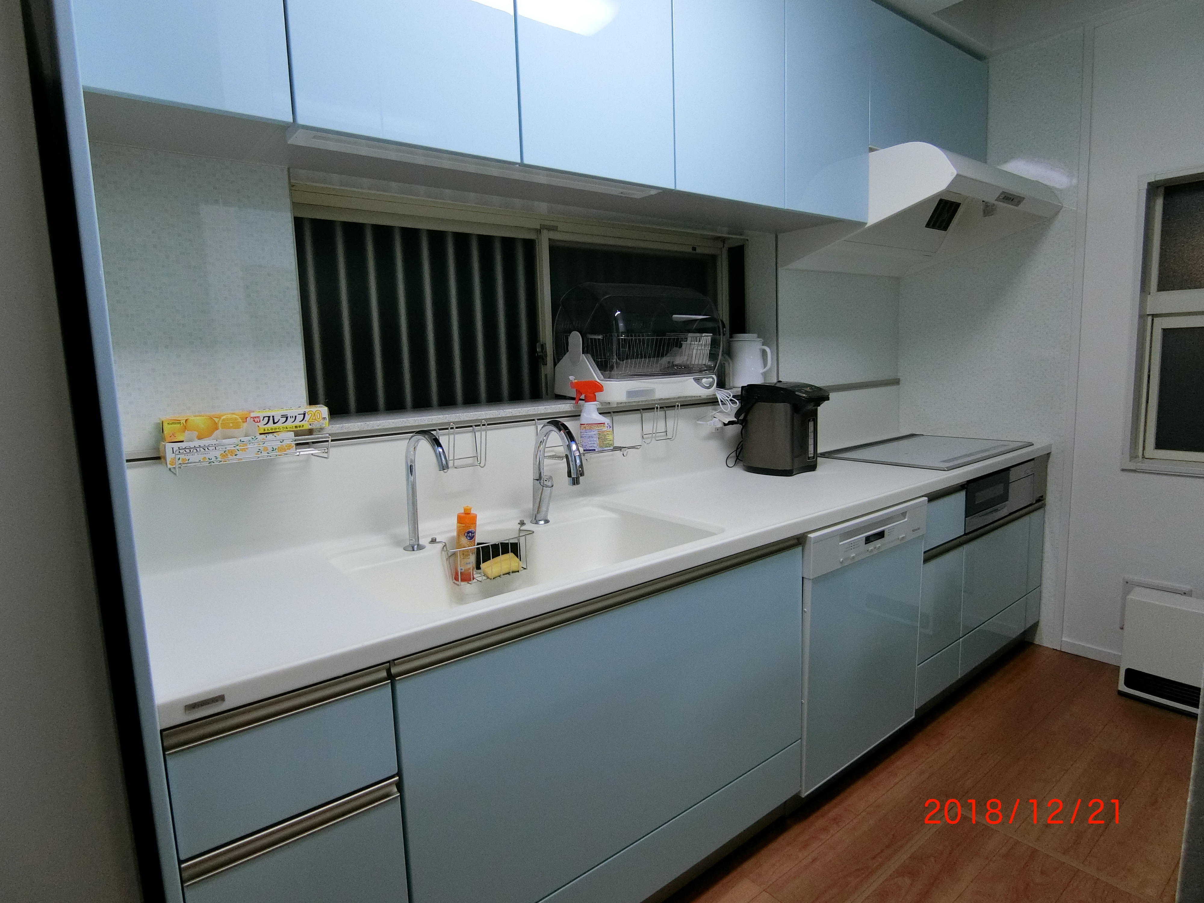 キッチンと背面収納も、取替えました。奥様の好きな青色のキッチンで、ガスコンロだったものをIHに替えたので、