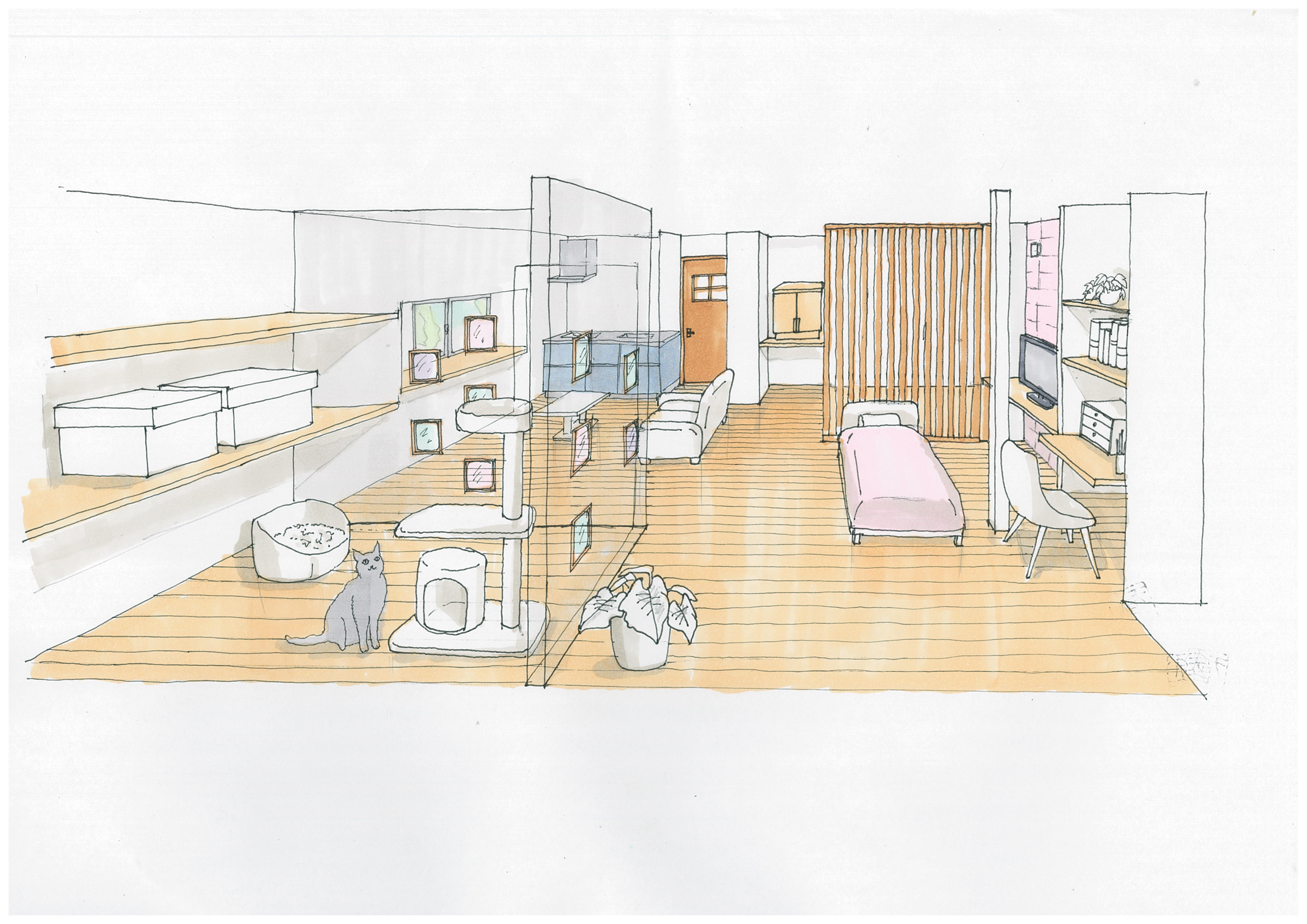 ワンルームに、寝室・リビング・ミニキッチン・書斎・猫ちゃん部屋が組み込まれ、気兼ねなくお友達を呼んでお茶をしたり、