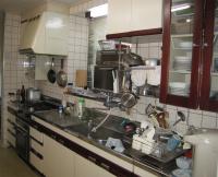 [Befor] 出窓にある食洗器が採光採風の障害に、壁面の水きり棚に置いた鍋釜をシステムキッチンに収めてスッキリさせたい。