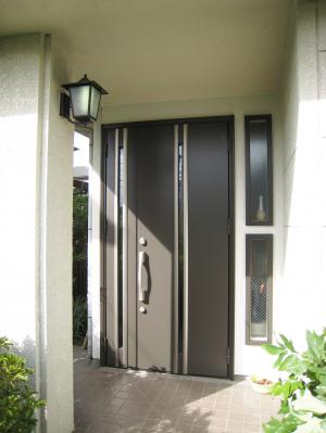 [After] トステムのアルミ製玄関ドアに交換。これまで欄間や袖壁にガラスが入っていて明るかったので、玄関ドアの脇にFIX窓を縦に2つ入れて採光を確保しました。
