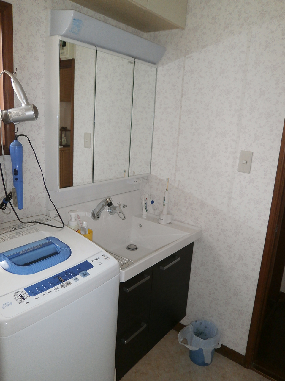 洗面化粧台も三面鏡、引出し併用扉にして収納力アップ。