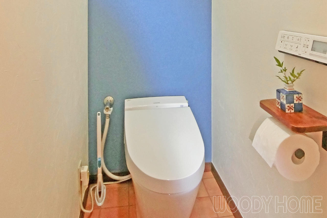 タンク式のトイレはシャワーのボタンも便座脇でした。タンクレスで便器が以前より奥に収まったことで扉と便器の間のスペースが広くなり、吊り戸を外して棚を一段としたので圧迫感が無くなり、窮屈ではない座り心地が良いトイレルームになりました。便器と同色だった紙巻器は小さな木製の棚に、奥の壁一面のクロスをアクセントでブルーとしてちょっとお洒落感もアップ。