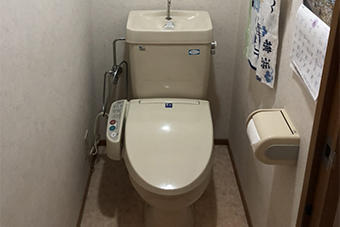 以前のタンク付のトイレでは奥の壁が遠く手が届き辛かったのですが、タンクレスで奥の壁が近づいたことから棚が使えるようになりました。トイレットペーパーに可愛い布を巻いて収納し、生活感をなくしました。 奥様のセンスの良さが感じられますね。