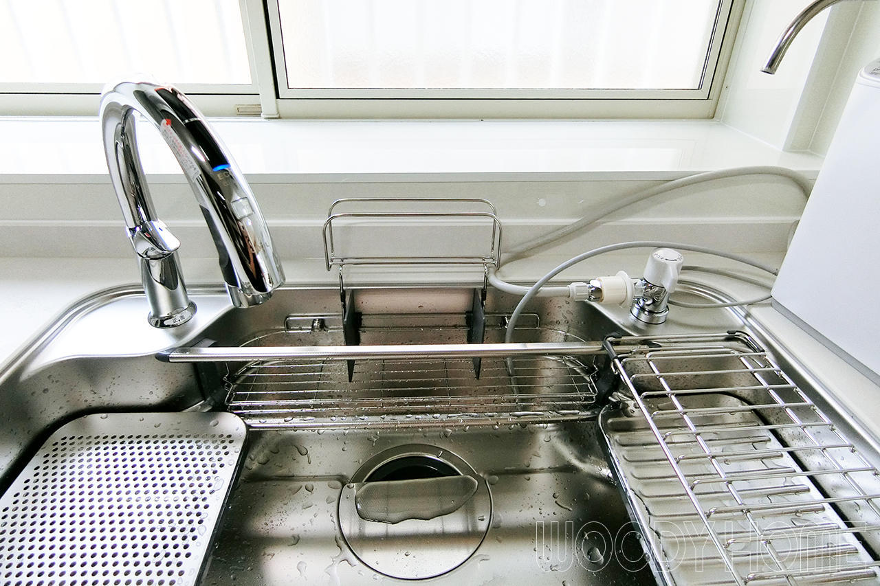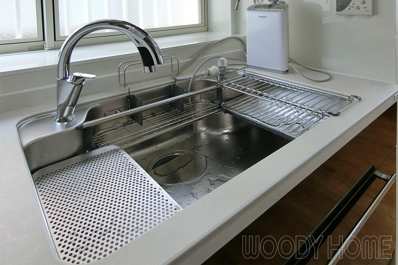 2段のレーンと2種類のプレートを組み合わせた料理の効率アップのためのシンクと、以前からお使いの水素水サーバーも設置できる広さのカウンタートップ。