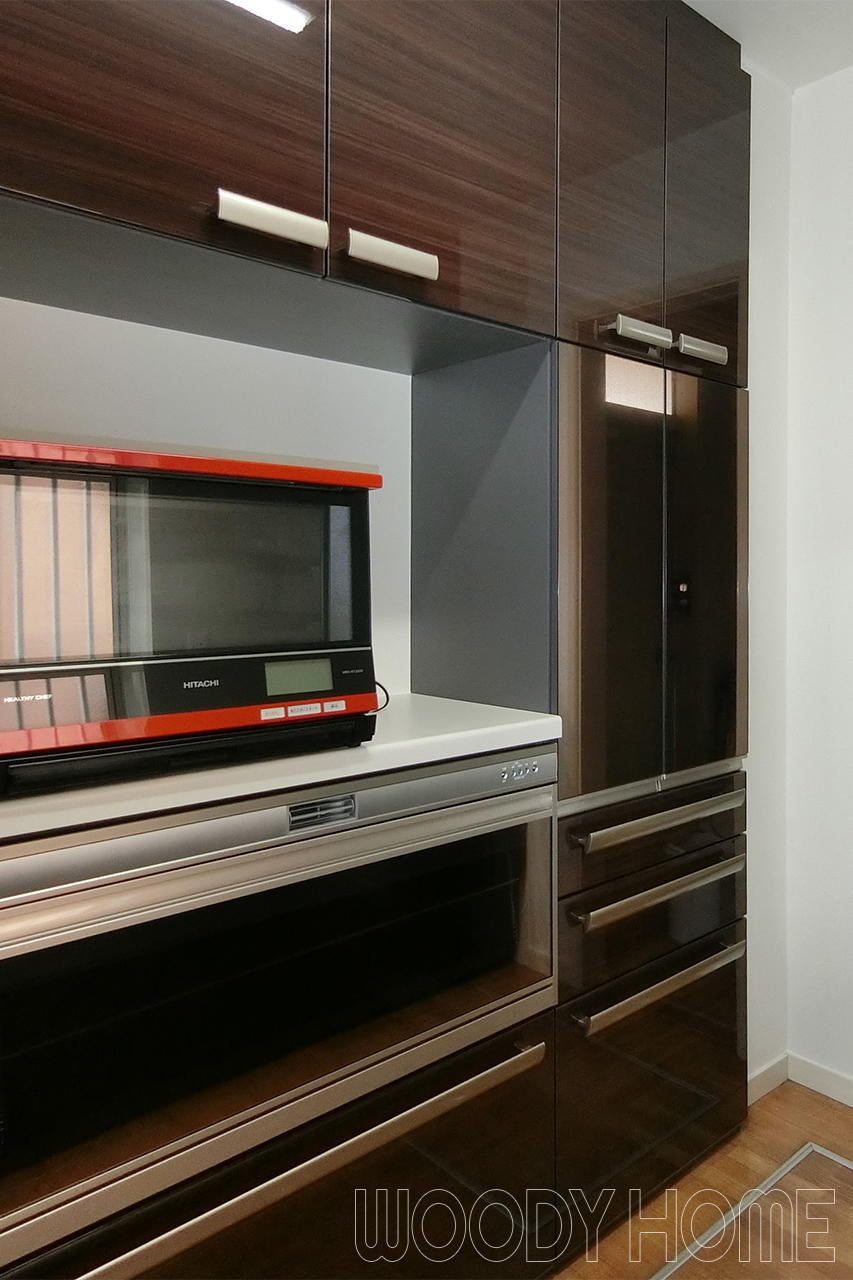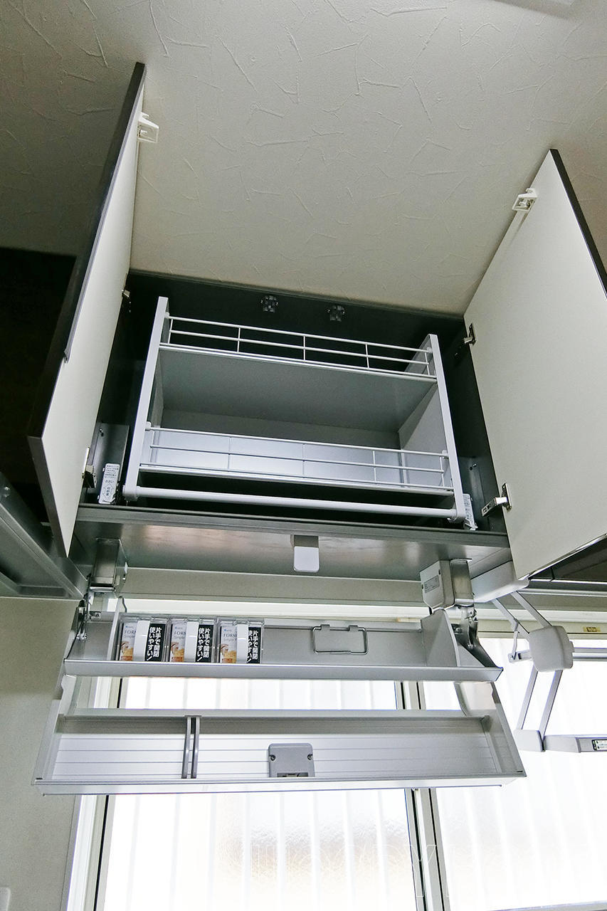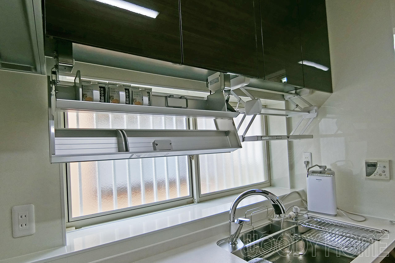 手の届かない吊り戸もは、ダウンウォールを付けたので踏み台に乗って物をとるという手間と危険がなくなります。