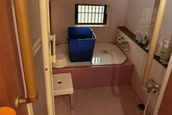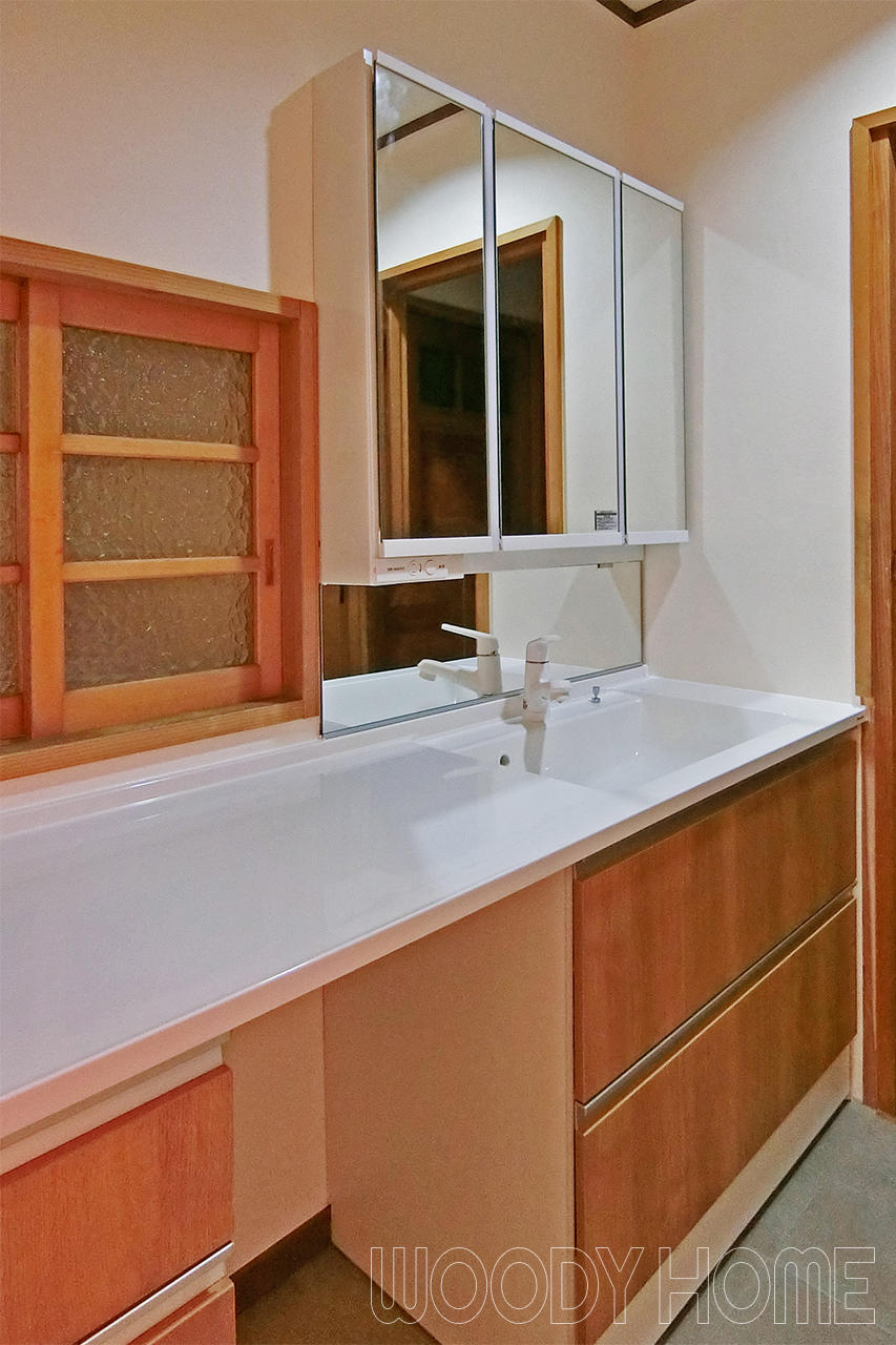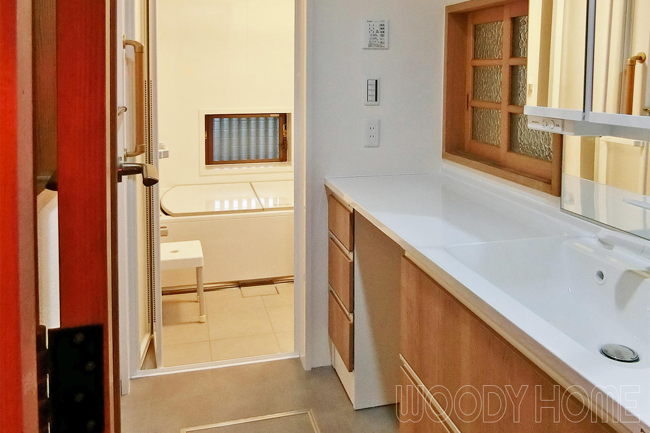 介護保険を利用した水まわりリフォーム。 カウンターの下に車椅子で入れる洗面化粧台に段差を無くした浴室でバリアフリー化しました。