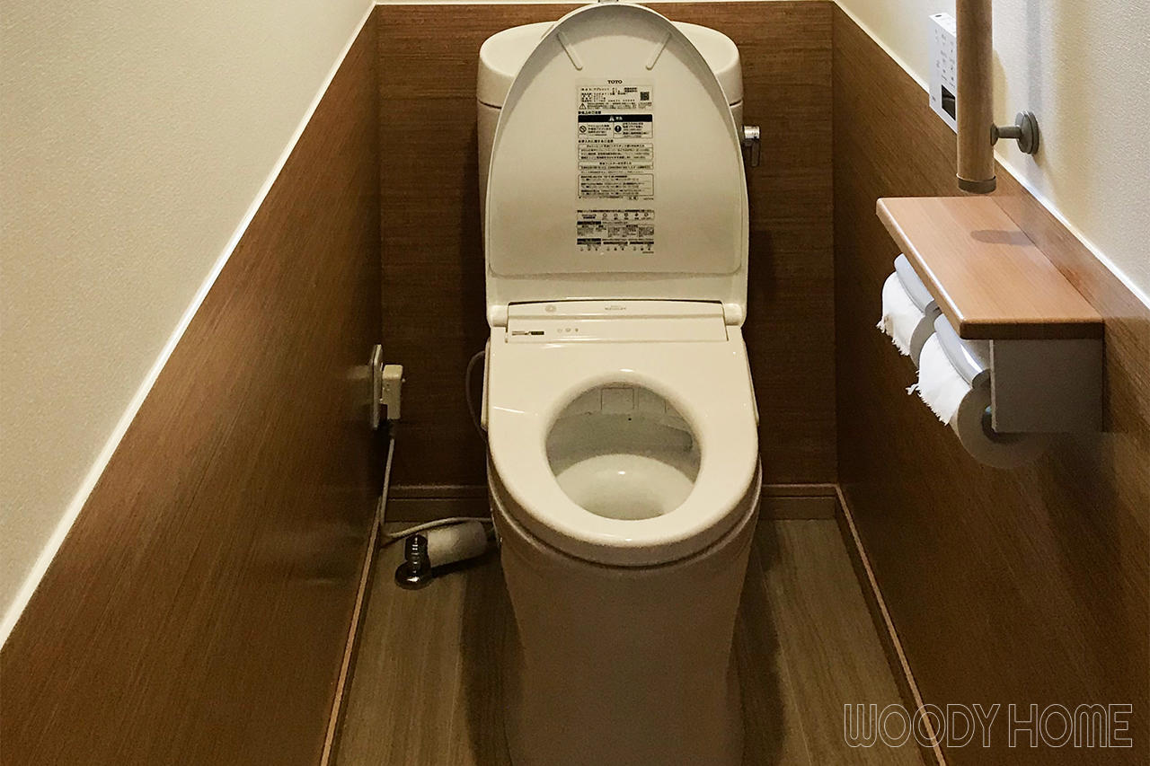床・腰壁は掃除もサッと拭くだけ。陶器製なので汚れの染み込みもなく衛生的です。トイレは除菌水が出るタイプなので、便器内も衛生的で掃除が楽になりました。