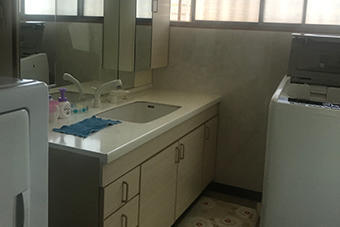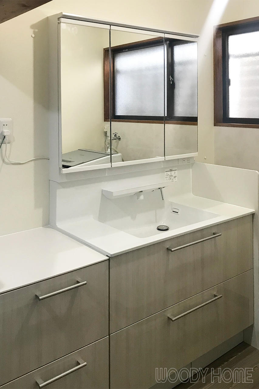 洗面化粧台は除菌水が出るタイプで、排水口の除菌はもちろん、歯ブラシなども除菌できます。また、水栓はハイバックガードから出るタイプなので、水栓の根元に水が溜まって汚れることもありませんし、自動水栓・自動手元照明付きで消し忘れ・出しっぱなしがなく節約にも一役買っています。