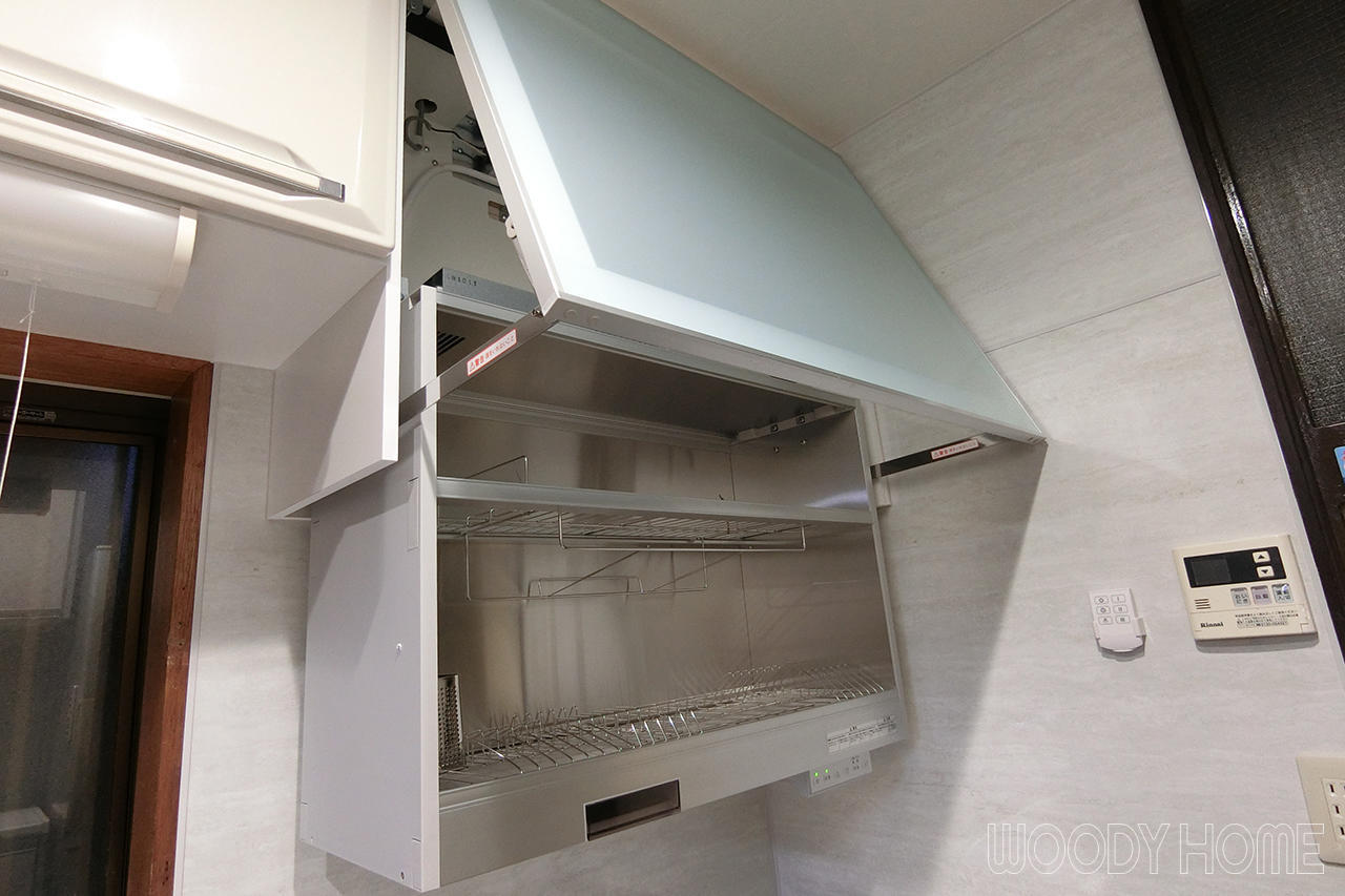 食洗器は不要だが食器乾燥機は欲しいというご要望から電動昇降吊戸棚を設置。シンクの真上にあるので、洗った食器をすぐに入れて乾燥できるので使い勝手が抜群に良くなりました。