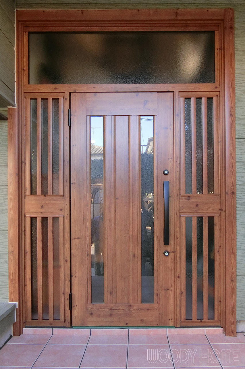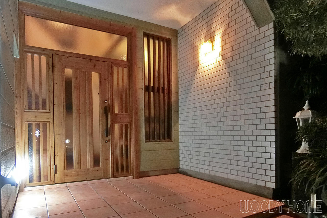 ランマ・両袖付きで木目の重厚なドアにリフォーム、採光タイプなので玄関が明るくなりました。また、玄関ポーチのタイルをテラコッタ風のものに張替えて綺麗になりました。