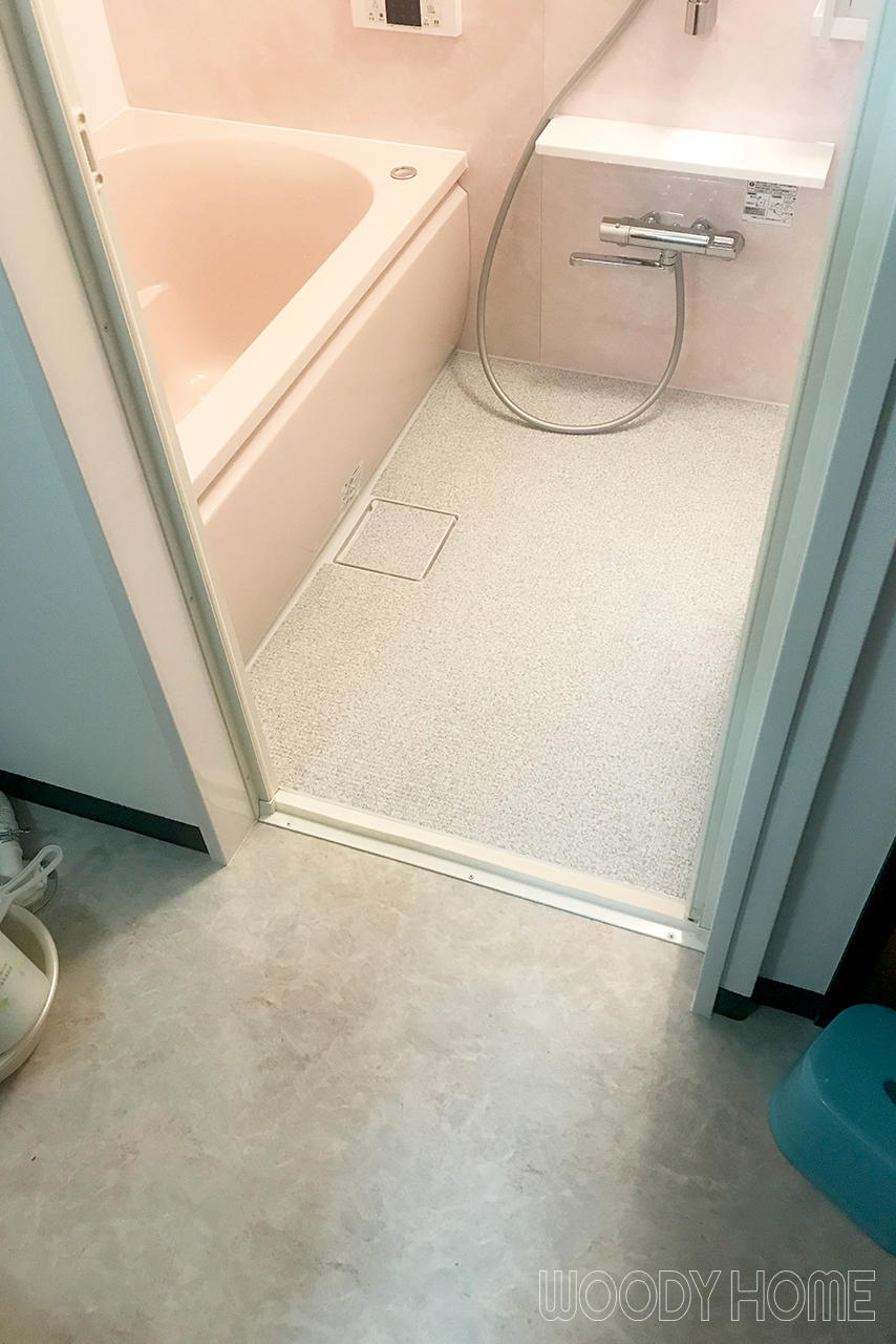 タイル張りで浴槽との段差や脱衣所との段差がある浴室。ガラスの2枚引き戸で仕切られているため、隙間風も入り冬はとても寒く安全面でも不安な浴室でしたが、段差が無くなり侵入風も大幅に減って快適なバスルームになりました。