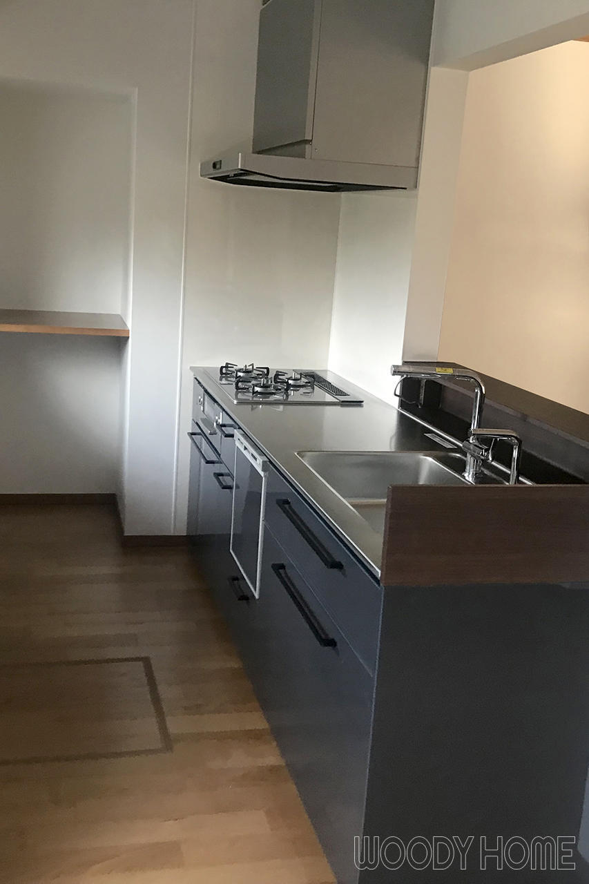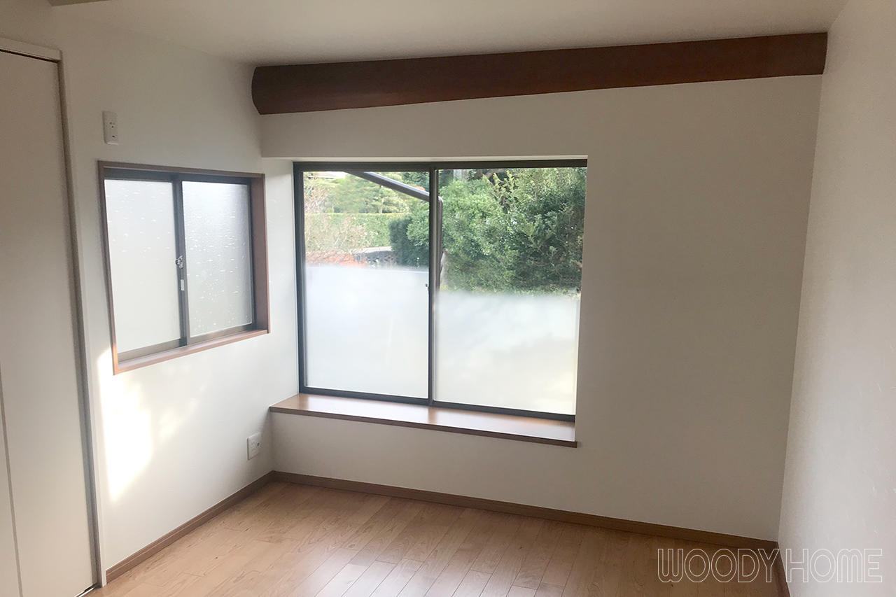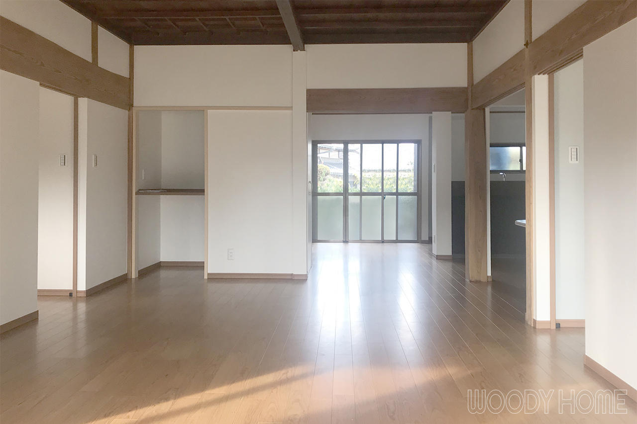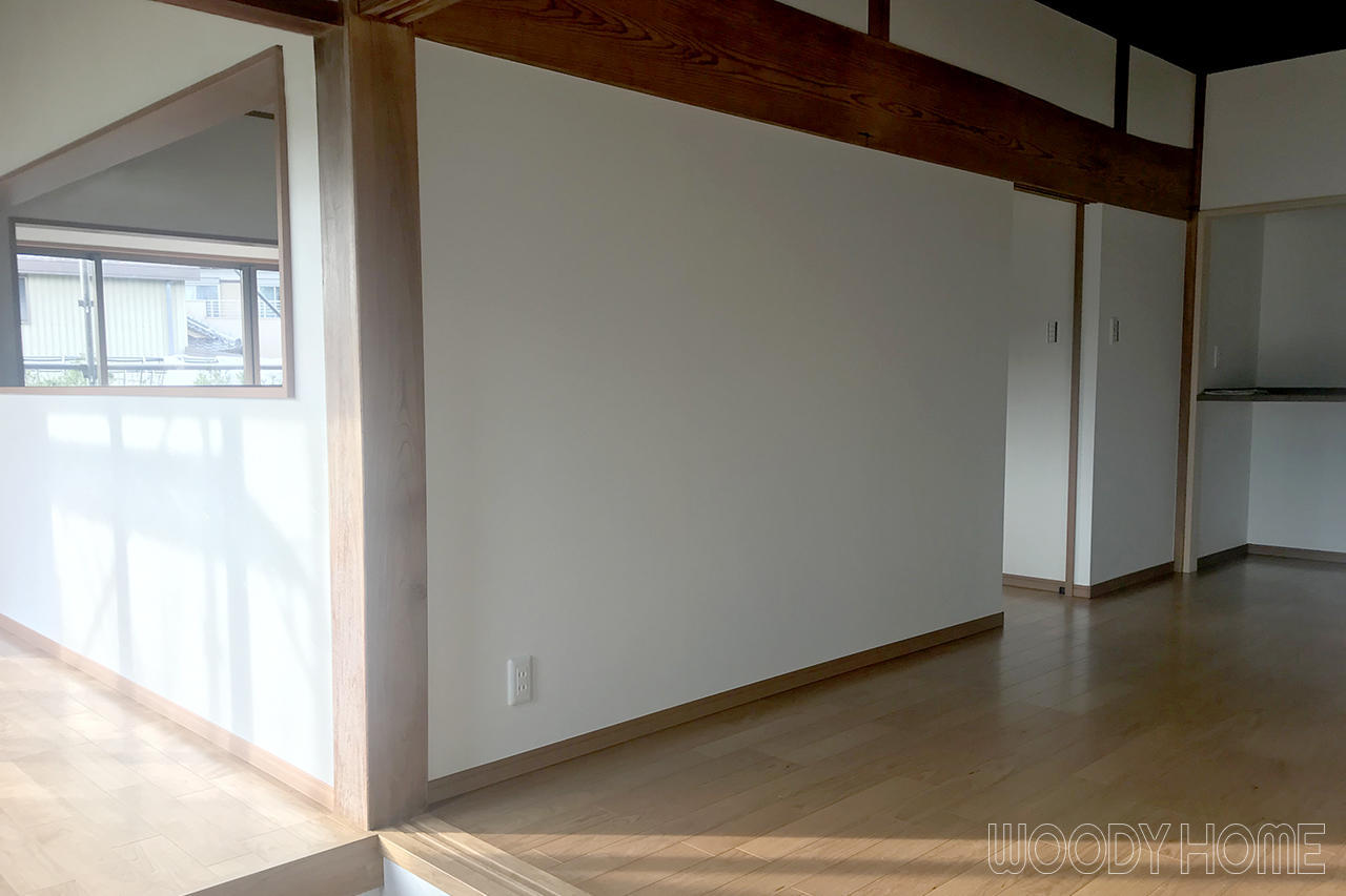 天井の立派な梁を見せる梁として残し壁面はクロス貼り。床もフローリングに貼り換えました。