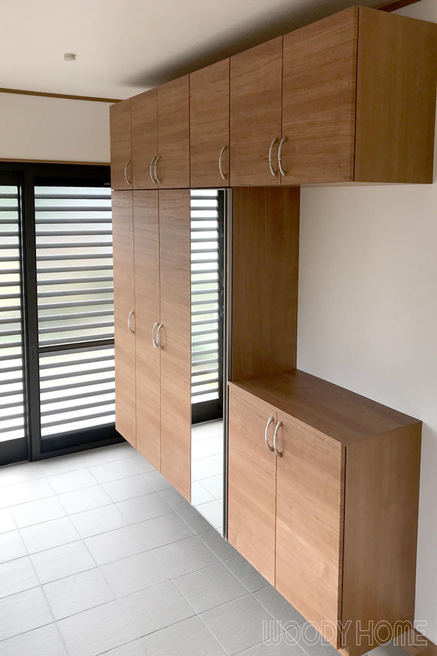 玄関土間はタイルを貼り、収納量たっぷりの玄関収納を取り付けました。長ものも入る優れものです。