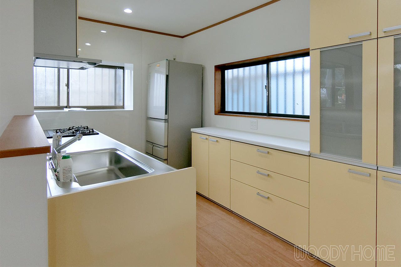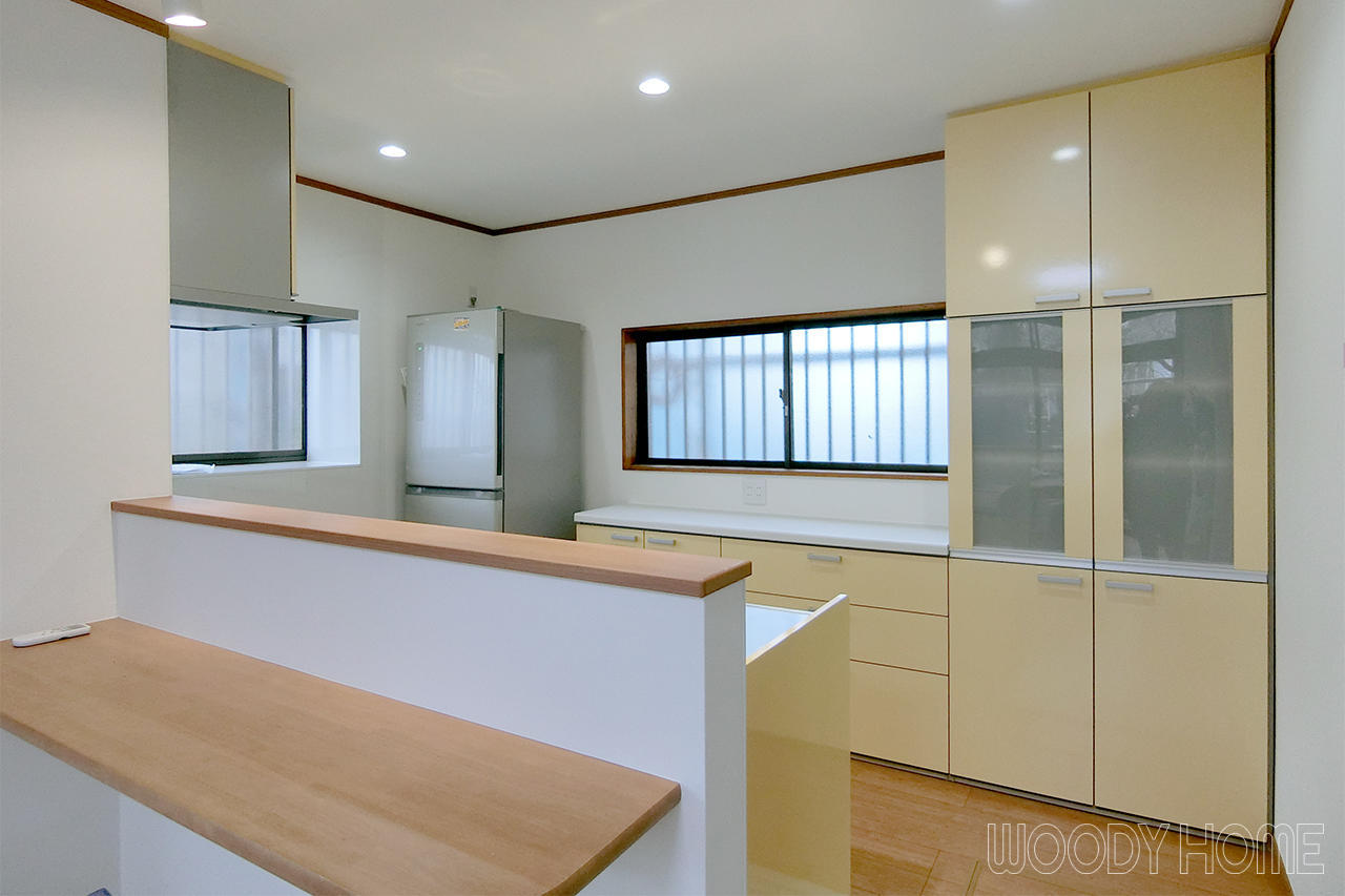 システムキッチンはLIXILの「シェラ」、収納が少なかったのでシステムキッチンに合せた背面収納を設置して収納力をアップ。このカップボードは窓の高さを意識し配慮しまた、カップボードのカウンター上に調理家電を置くことも考えコンセントを設置。窓ガラスは真空ペアガラスに変えて断熱性をアップ、冬でも快適に炊事ができます。キッチンとリビング・ダイニングとの境の壁を取り払い、対面式のキッチンを配置しカウンター越しにテーブルを造作したことで、炊事をする奥様と向かい合いながらご主人がお酒を楽しめるようになりました。