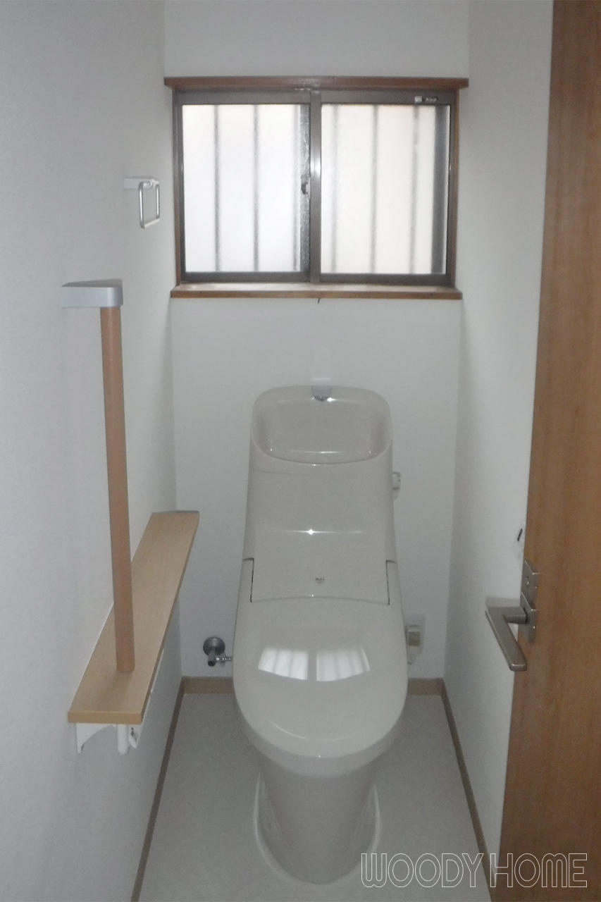 スッキリしたデザインだけでなく、使用水量も30年前の便器とは違うので節水(1回の使用水量が5~6リットル程度)できるエコロジーな便器で、アクアセラミックで汚れが付きにくく綺麗が長持ちもします。安全面を考え棚手摺をつけて使いやすいトイレルームにもしています。