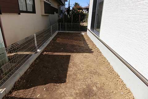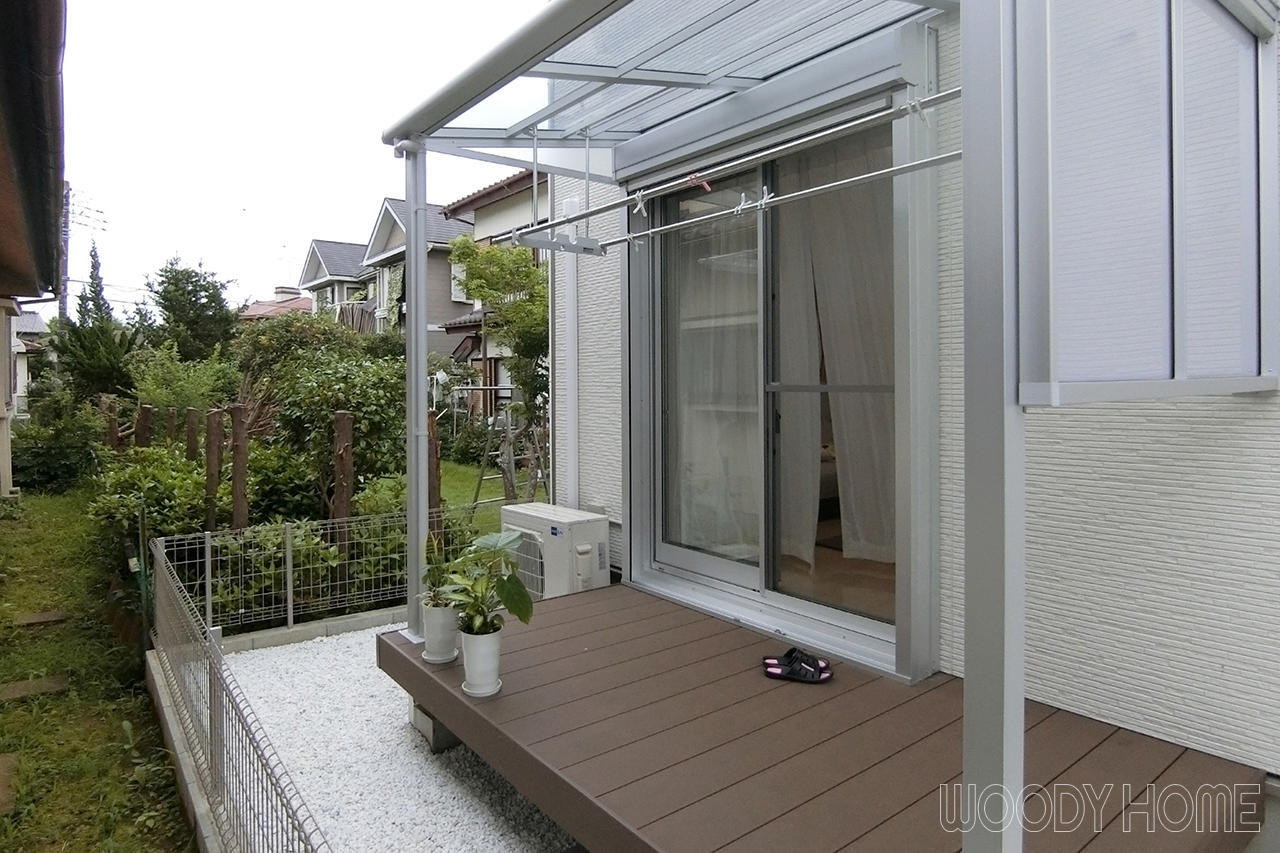 土のままだったお庭は、防草シートをひいて白い玉砂利を敷き、樹ら楽ステージとスピーネを設置、洗濯物が干しやすく、急な雨でも干したものが濡れなくなりまた、お子様用のプールを置く事もできます。白い玉砂利で明るいお庭になり、雨の時の泥によるぬかるみが出来なくなった他、砂利の音鳴りが防犯対策にもなります。