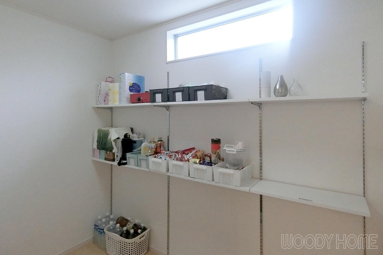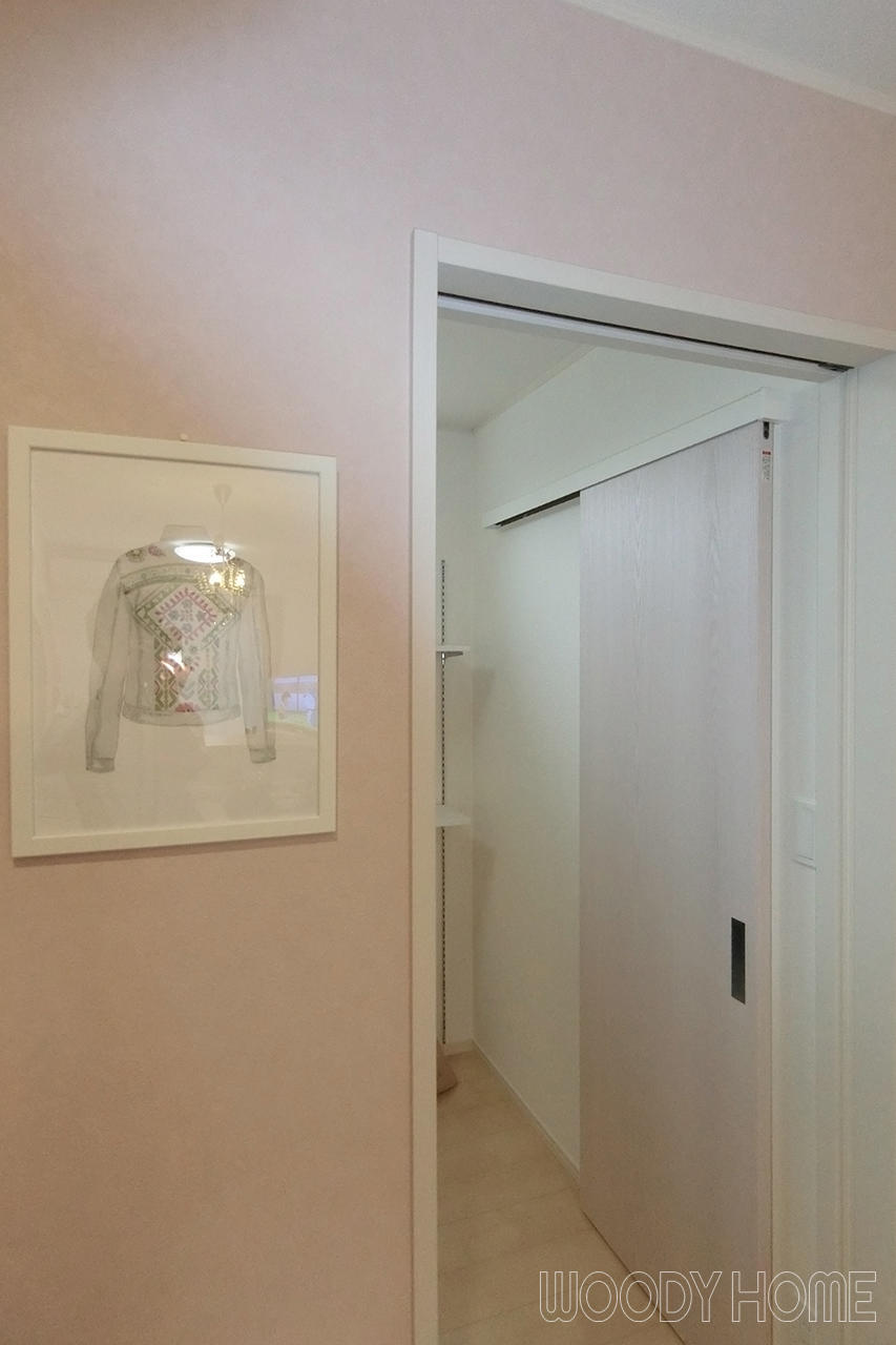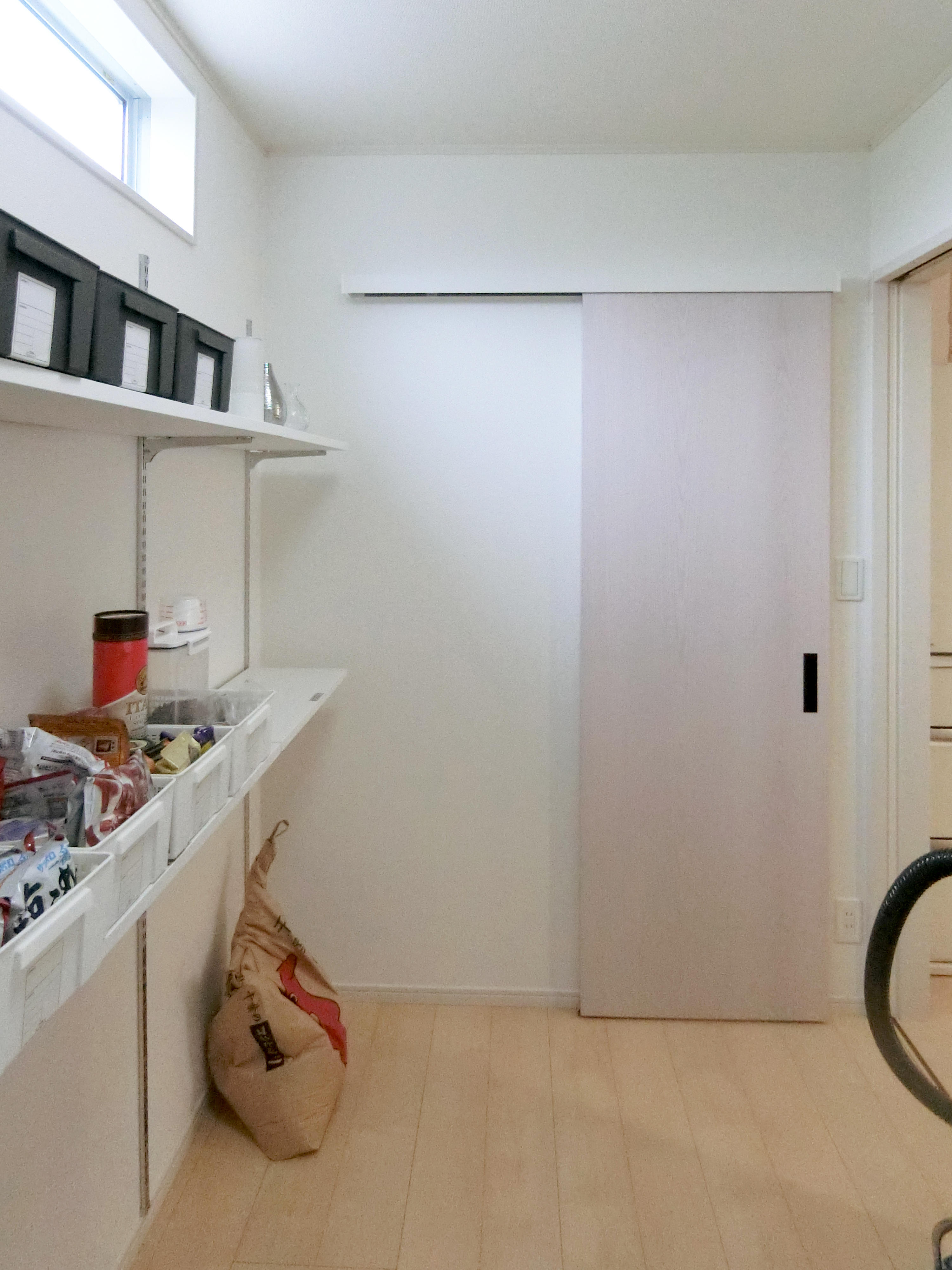玄関ホールとの壁に開口を造り、引き戸をアウトセットで付け直接入れるようにしました。扉は奥様の好きなピンク色、引き戸「パレット」の新色です。たくさん買い物・重い荷物でも玄関からすぐにパントリーへ仕舞えて便利になりました。