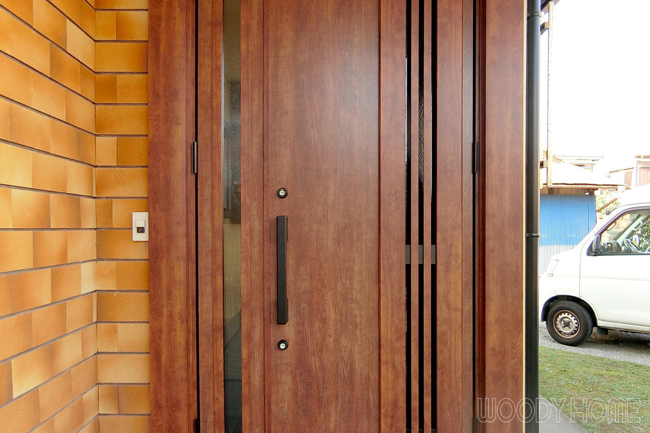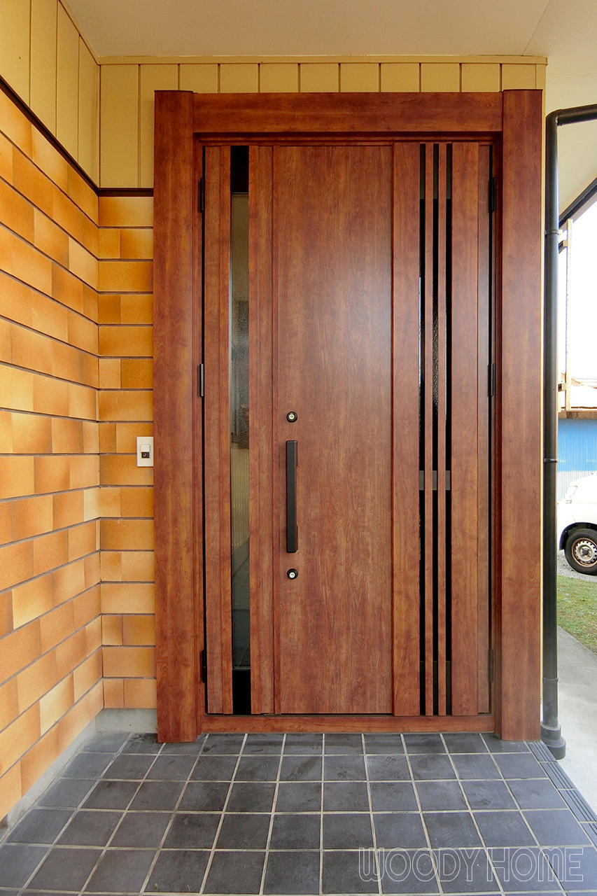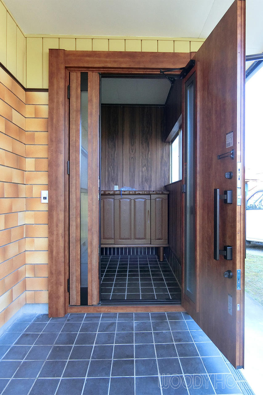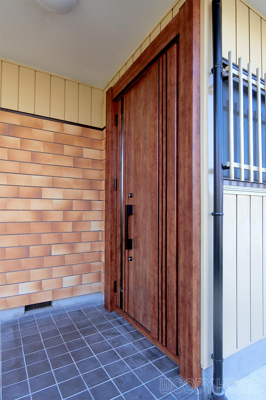 欄間部分も扉になったことで背が高くなりスタイリッシュな玄関になりました。額縁が太くなるのを気にされていましたが、逆に重厚な仕上がりにもなりタイルとの色合いとも合っていて満足いただける仕上がりになりました。断熱タイプの扉で断熱性を上げながら、採風タイプでもあるので扉を開けずに風を取り込み、玄関だけでなく屋内の換気にも一役。臭いや湿気対策にもなりますね。