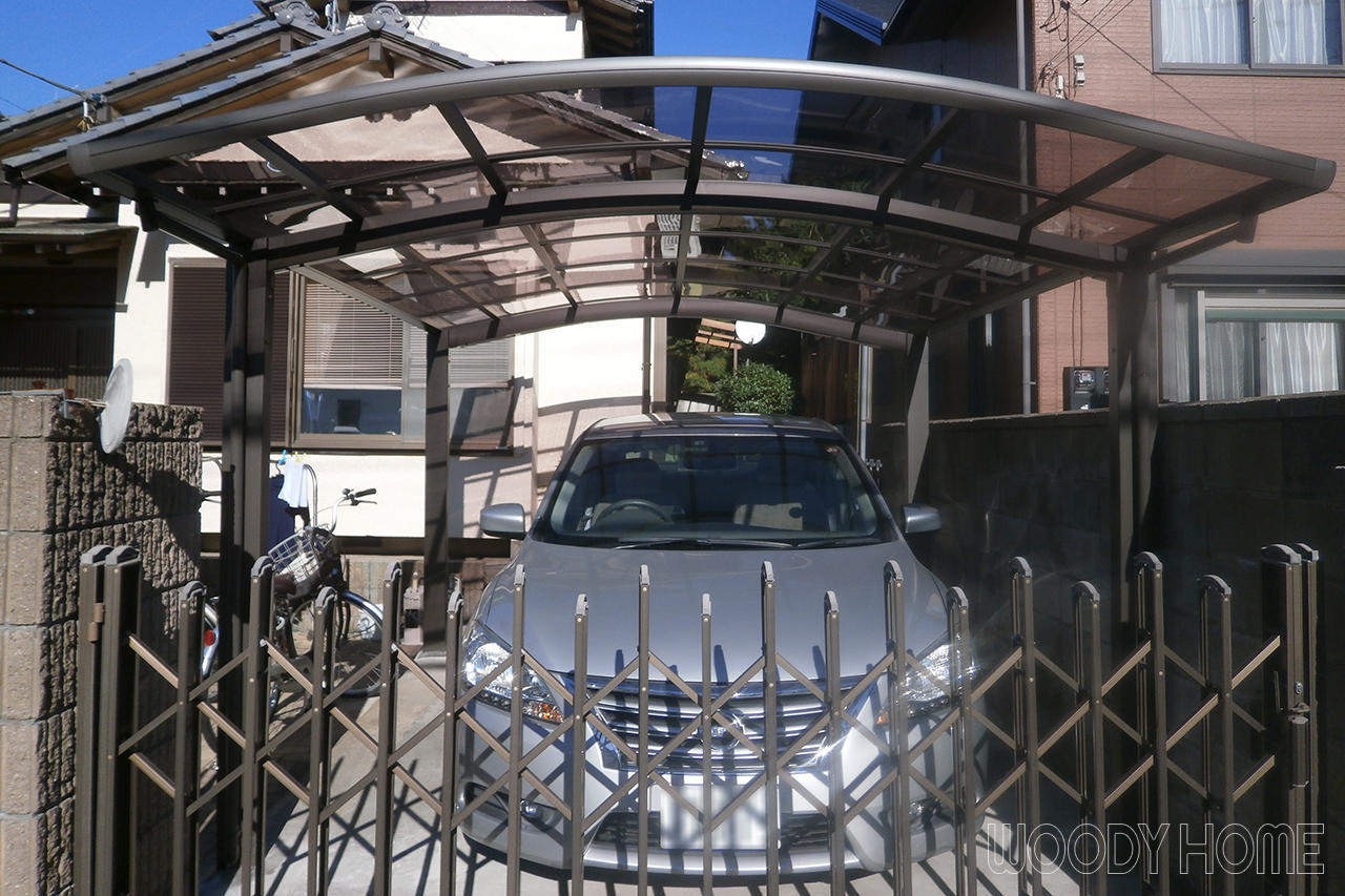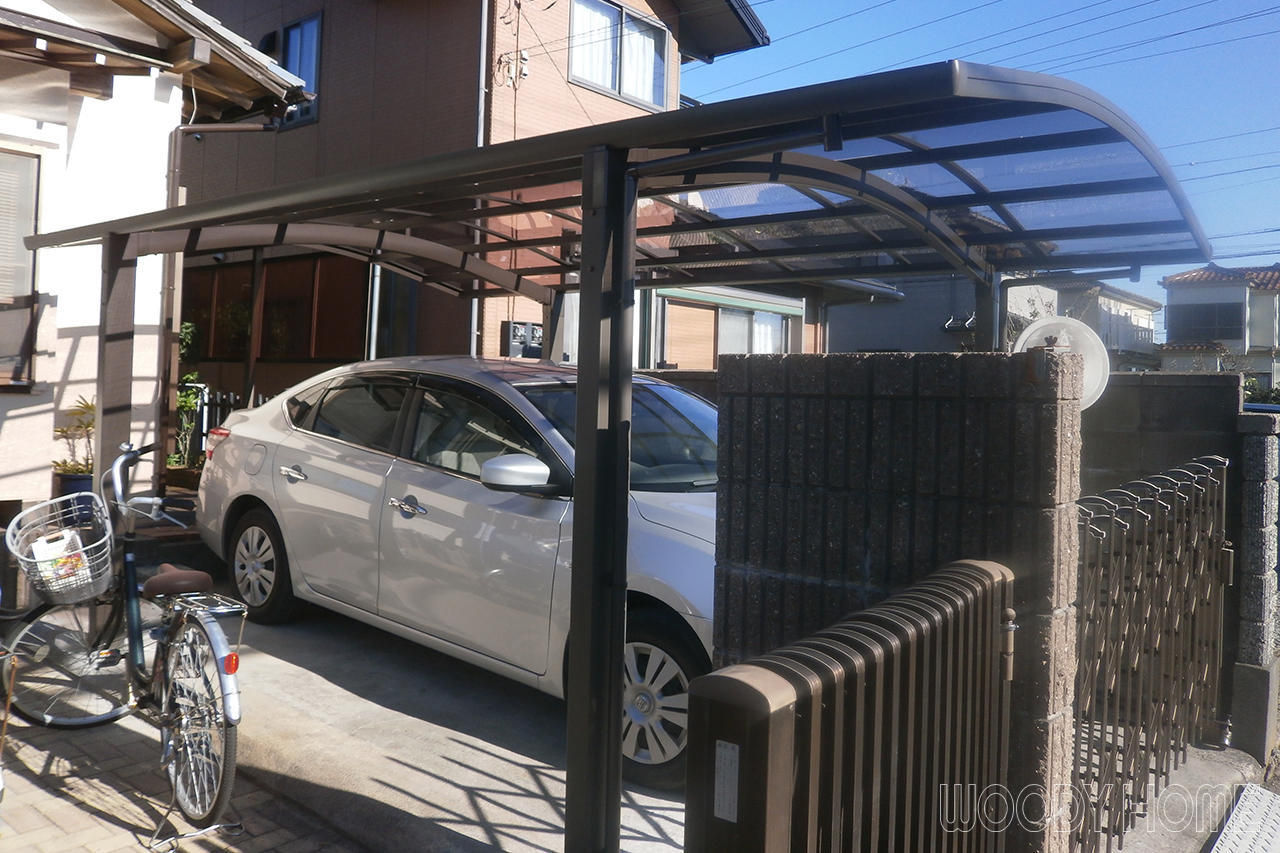 台風被害で屋根のポリカが飛んだカーポート。経年劣化などを考慮、先を見据えて修理ではなくカーポートをリフォームで交換しました。